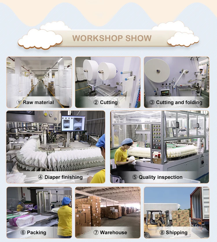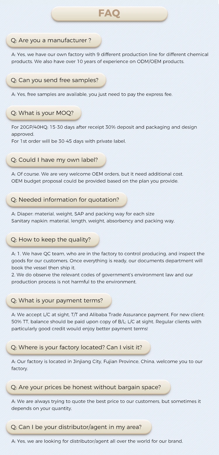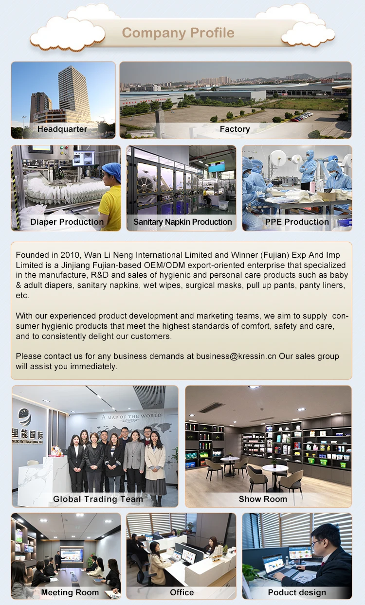 Material Details | Sumitomo Japan SAP; Georgia Pacific USA Pulp; Super-absorbent Core; Green Leak Guard; Green ADL; Wet Indicator; Colorful Backsheet; Elastic Waist (Single); PE film; PE Tape; Natural Aloe Perfume. |
