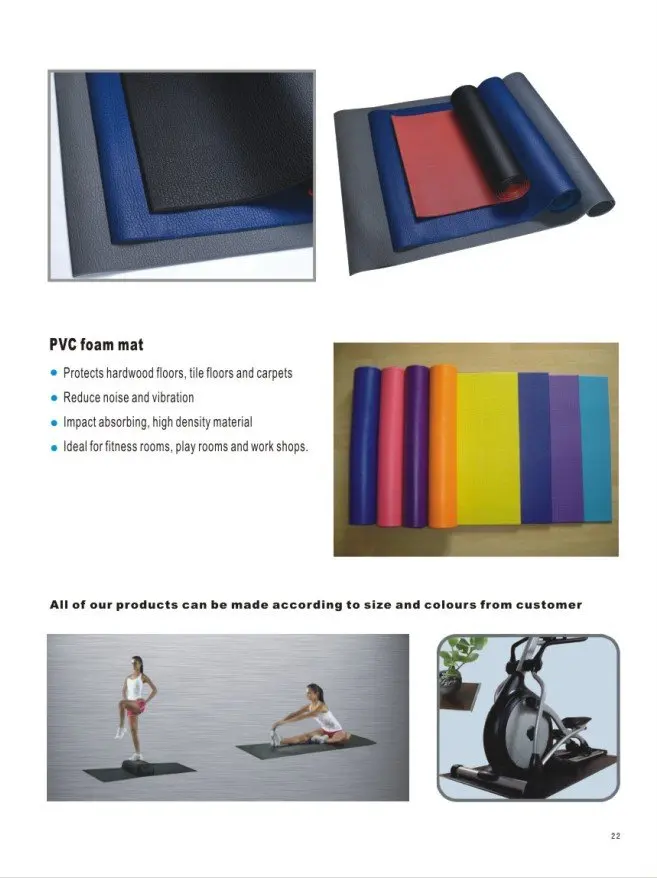 2.PVC and XPE foam Mat, such as Treadmill mat, Sports equipment mat, Exercise mat, Bathroom mat, Children's game mats, Training mats, Camping damp proof mat, etc