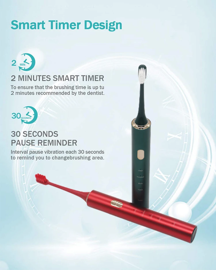 Since the electric toothbrush is placed in the toilet for a long time, it is easy to carry bacteria, which makes the sanitation of the electric toothbrush itself not high.The electric toothbrush we developed has a multi-layer antibacterial layer on the surface, which can effectively disinfect and sterilize independently
