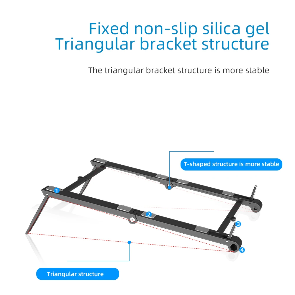 · Portable and Foldable · Multiple Angle and Height Adjustment · Thoughtful and Ergonomic Design · Heat Dissipation Design · Superior Material for Steady Holding