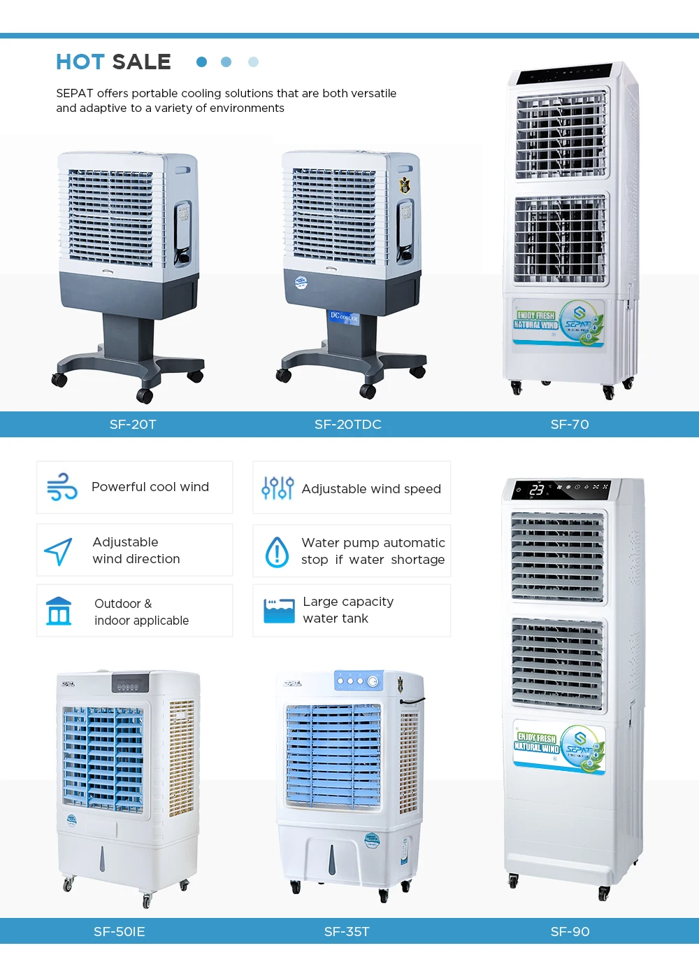 Our products all are self-developed, have many kinds of Industrial Design Patent, Utility Model Patent, and won certificates, such as : CE, FCC,CB,ETL,SASO and through ISO9001 international quality management certification. We export products to the world: Europe, America,Southeast Asia,Middle East and Africa. Our SEPAT brand products gain wide praises at home and abroad. We also welcome OEM and ODM orders. Besides, we are making great efforts to develop new products to meet different requirements. We build our reputation with professional, honest, responsible and a hard-working attitude. Insisting on 3G standard“GOOD QUALITY & GOOD SERVICE & GOOD PRICE" building our own Chinese Air Cooling & Heating brands!