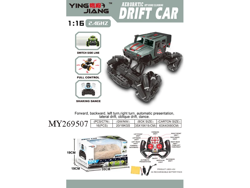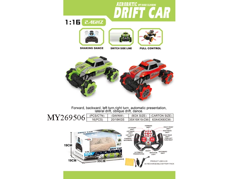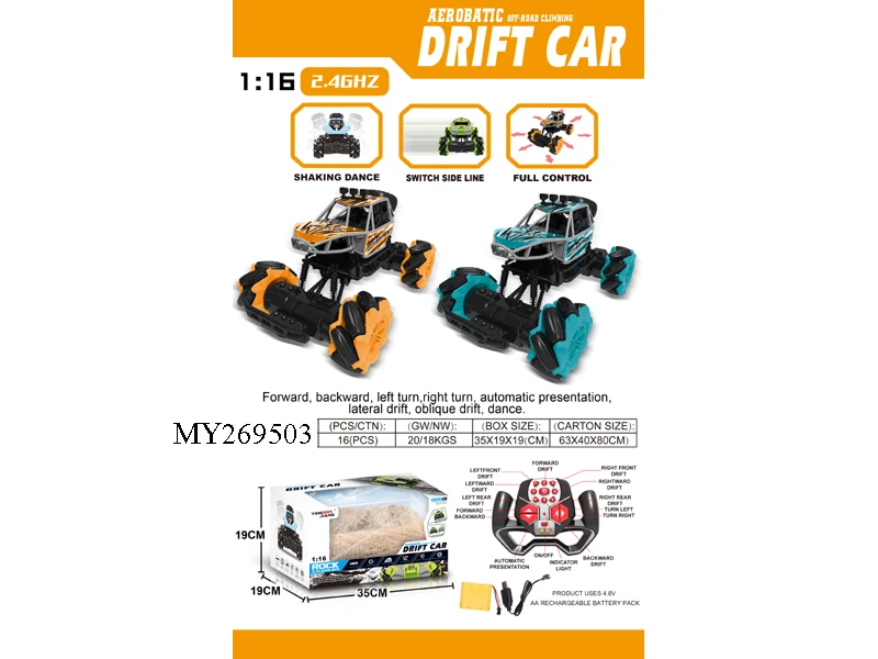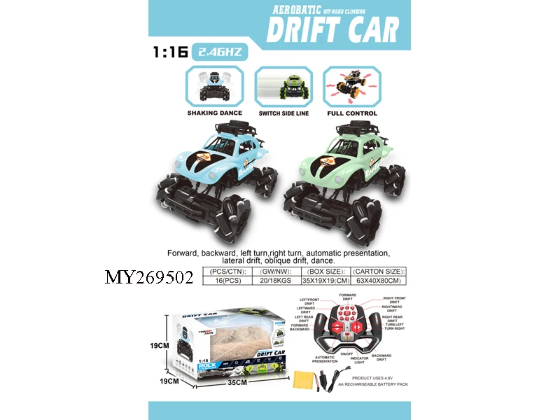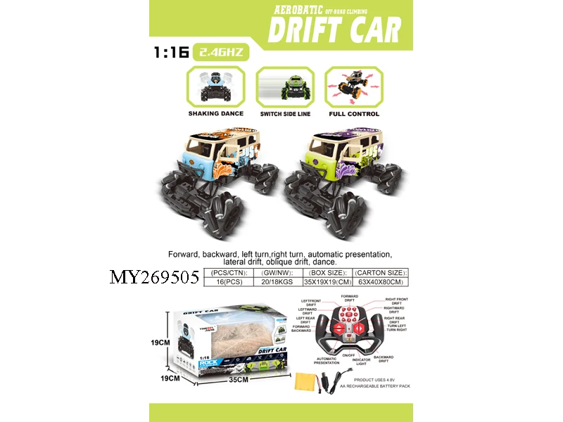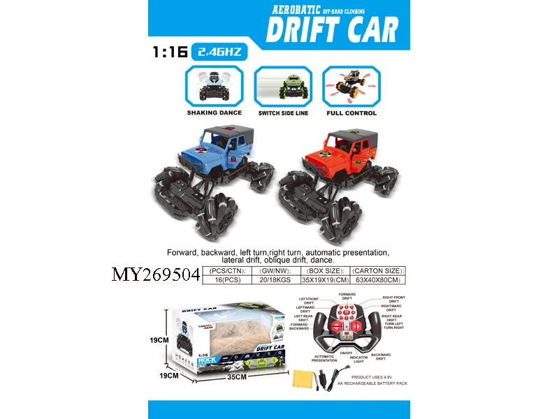function : | Forward, back, turn left, turn right, sideways, drift diagonally, 360º rotation automatic demonstration, strong climbing force, twist, dazzling light, 2.4G remote control operation, light spray, 7.2V rechargeable lithium battery included , USB charging cable |