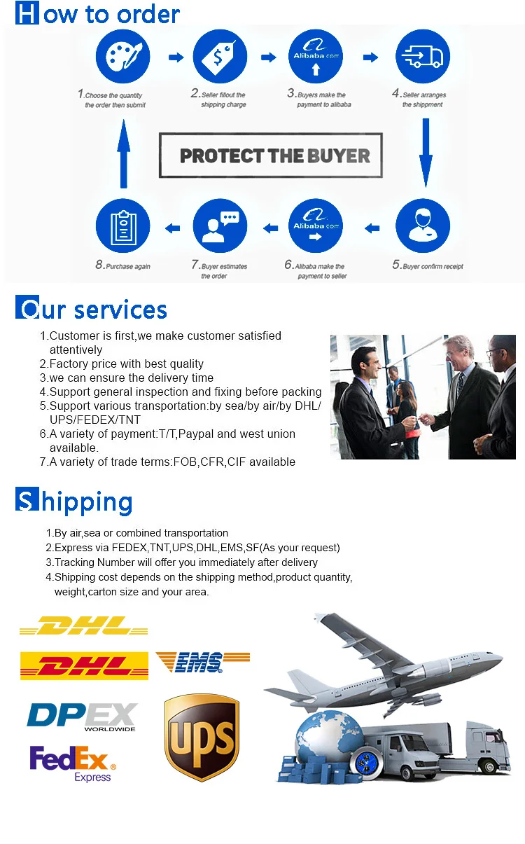 A: If order quantity is less than 50pcs, the total volume is less than 1CBM, courier such as EMS DHL UPS FEDEX is suggested according to our experience. If you order bulk quantity, Delivery by sea or air is available. If you have your own forwarder,we can contact them to complete shipment.