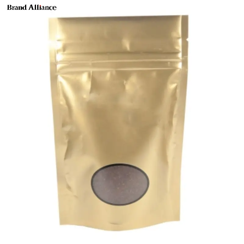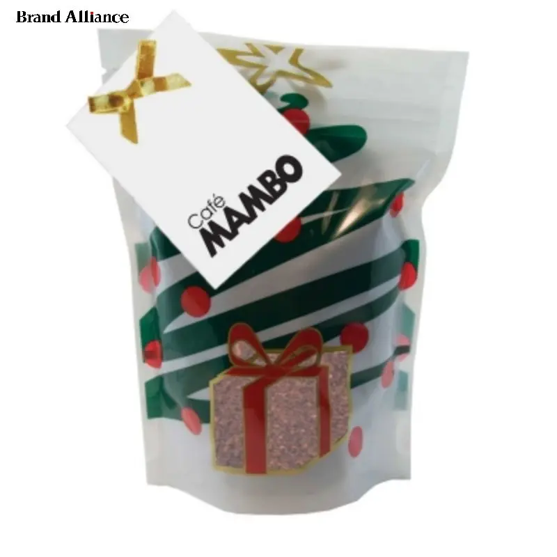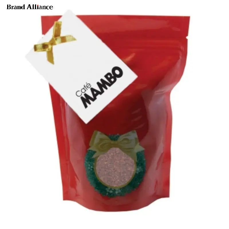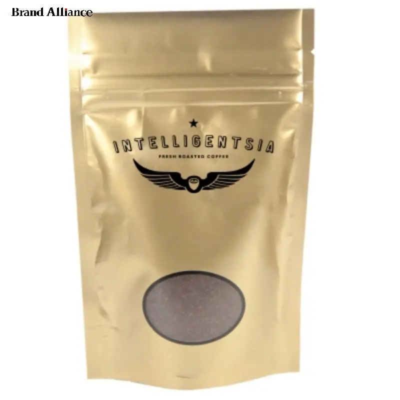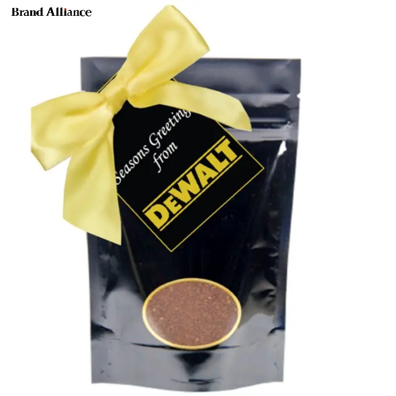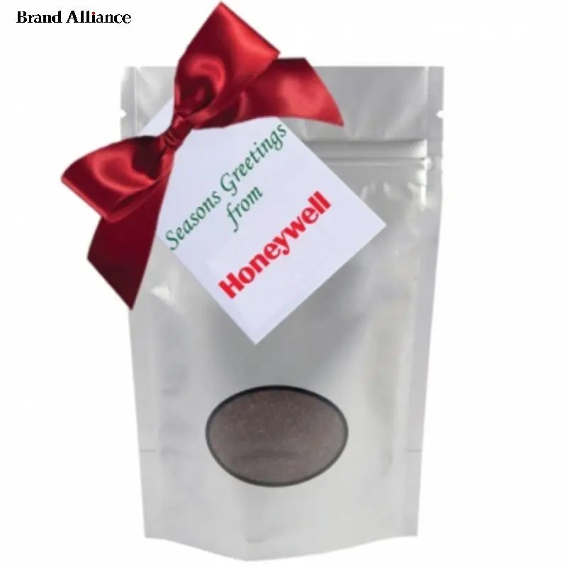 ground gourmet coffee in a heat sealed foil bag. Customize with a