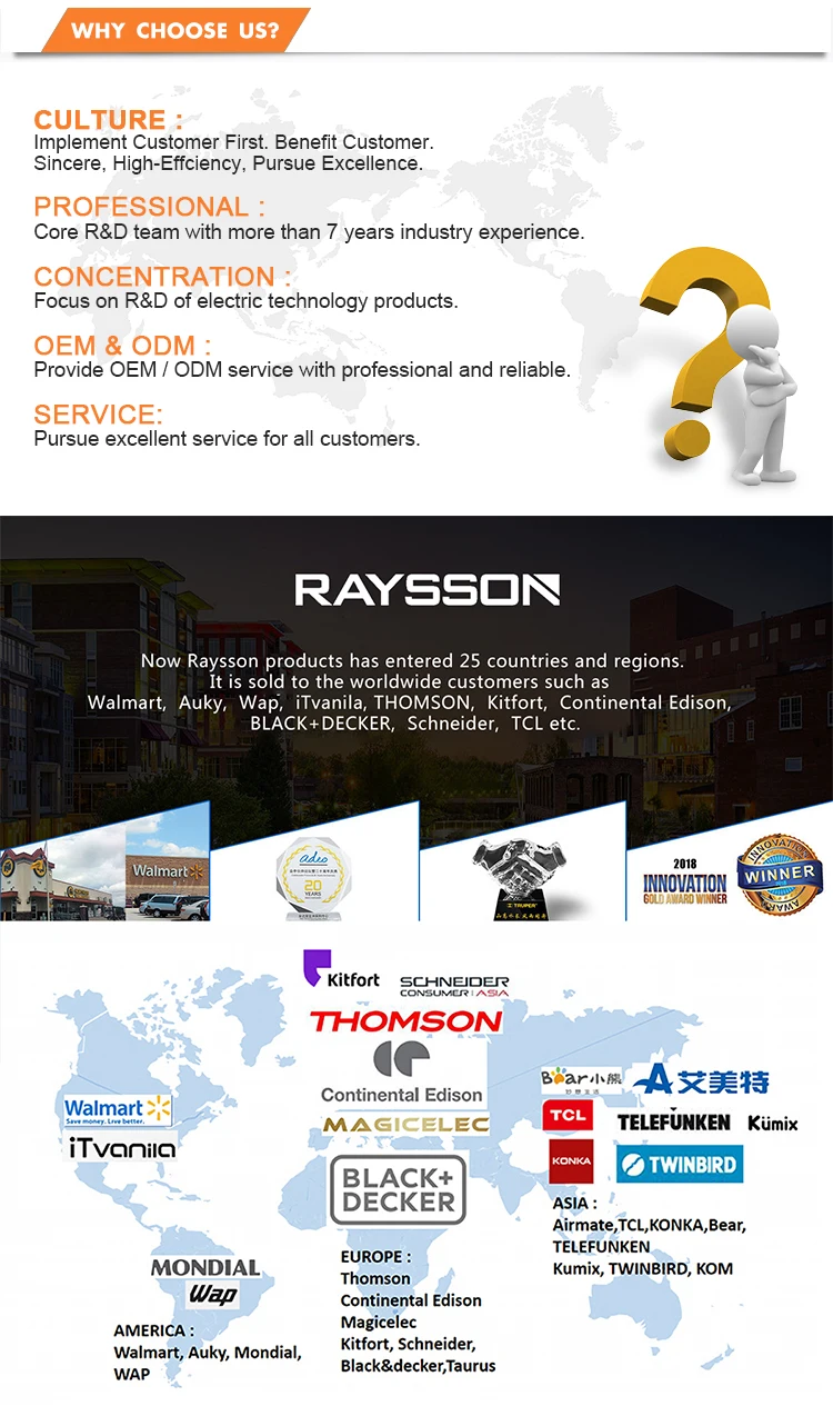 Based on our advantages of products quality, great service and competitive price, our products were already sold to overseas more than 25 countries in different area like North America, South America, Europe, Australia, Asia, Middle East etc, and sold to many word famous company such as Walmart, AUKY, Wap, Thomson, Kitfort, SCHNEIDER, TCL, etc.
