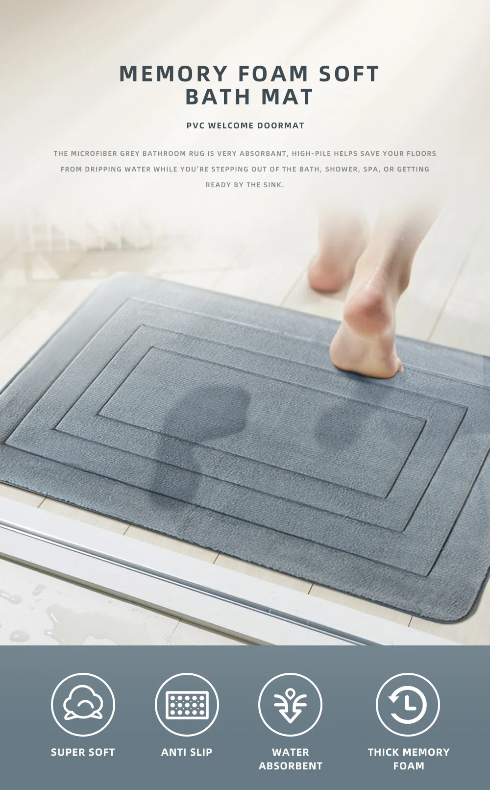 Soft water absorbent memory foam non-slip bath mats