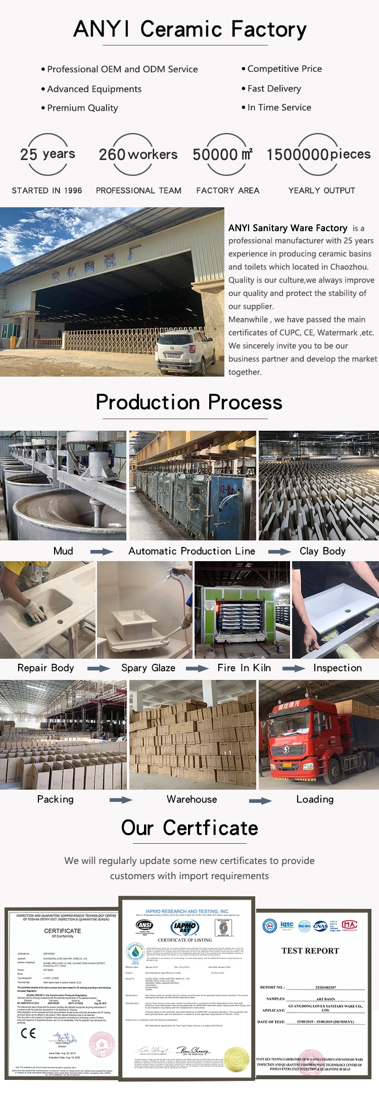 Q1. Are you manufactory or trading company ? A. We are 25 year-old manufactory and have a professional foreign trade team. Our main products are bathroom ceramic wash basins.We are also welcome you to visit our factory and show you our big chain supply system.