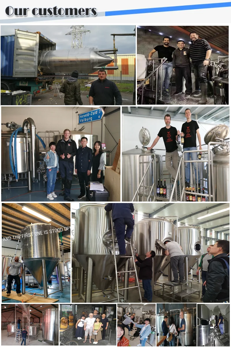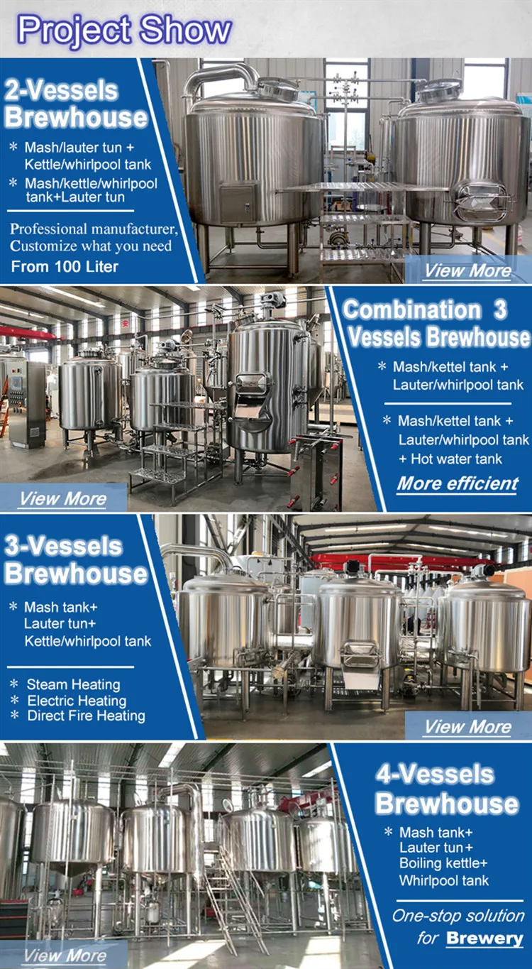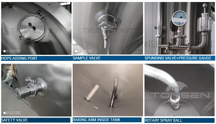 Spare Parts | 25% head space; Full sanitary butterfly valves; Equip with Electromagnetic valve; 360°coverage CIP spraying ball; Tube level with measurements; False bottom/ sieve plate for lauter tun; Raker with VFD for mash/lauter Tangential port for whirlpool Sparge ring for lauter tun; Thermowell with high accuracy temperature sensor: PT100 Ice water pipe: PPR; Ice water pipe insulation: Rock-Wool; Stainless steel manway(option:glass manway) Option:led lamp Other special request, can be customized according for your brewhouse |