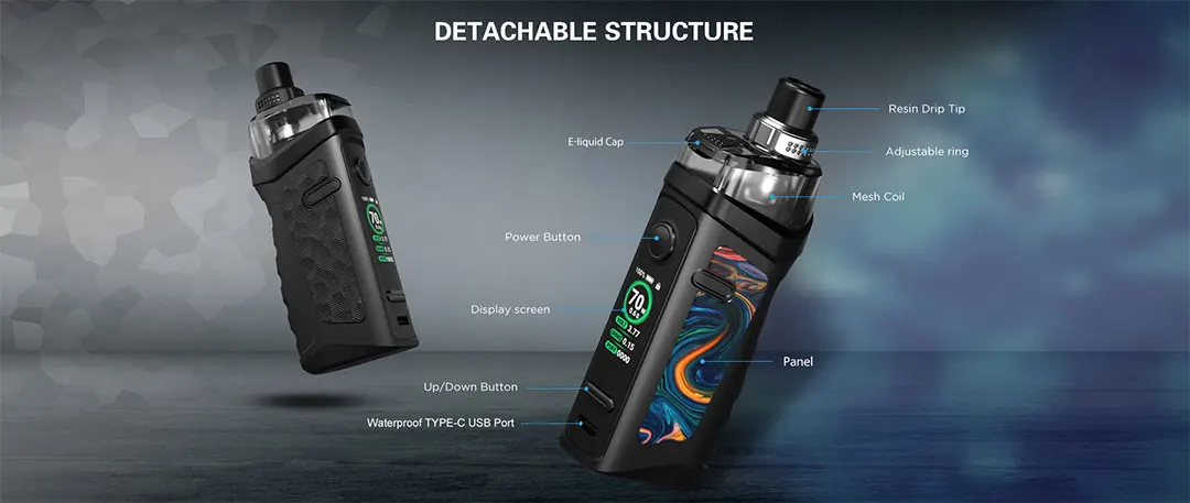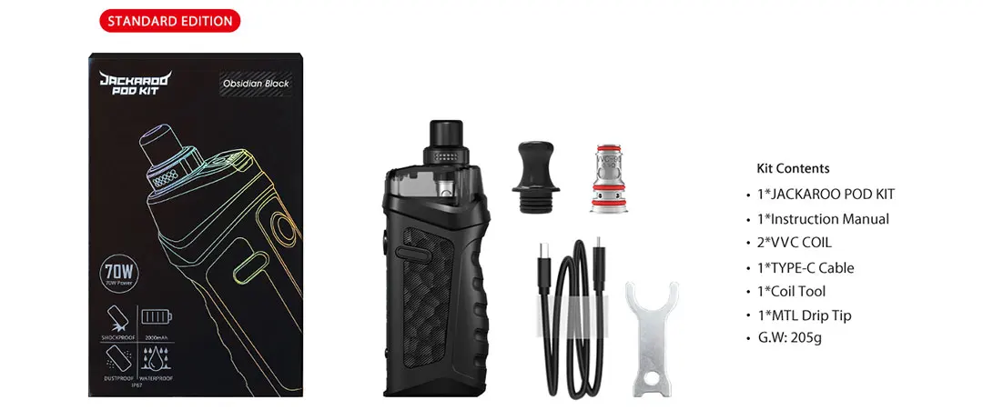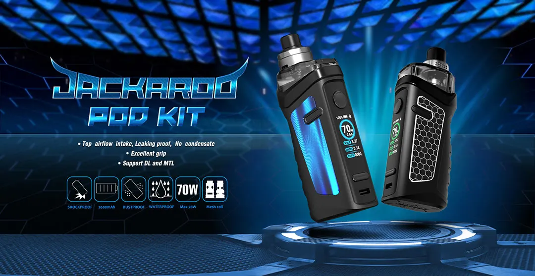 The Jackaroo Pod Kit by Vape is a 2000mAh Internal Battery Device. It measures 108mm x 25.6mm x 40mm. The Juice Capacity is 4.5mL. Weight of the Pod System is 4.6oz or 130.41g. That weight is with the Device, Pod, & Coil. The Wattage Range is 5W to 70W & can fire from .1 Ohms to 3 Ohms. It is Top-fill and has Adjustable Airflow. This can be used for DL & MTL Vaping. It is rated IP67 so it’s Waterproof, Dustproof, & Shockproof. It charges fast via USB Type-C. It’s available in 8 Colors.The Top-fill & Top Airflow make it really hard for liquid to leak.There are multiple safety protections; Short Circuit, Over Temperature, Low Battery, Battery Overcharge, Overload Current, & 10 Second Cutoff.The shape & design of the Kit are Ergonomic & the grip is very comfortable making this extremely easy to hold.There are 2 types of Pods. 1 for Pre-Built Mesh Coils & 1 for DIY Coils.We have been using & testing this item and so far it has worked