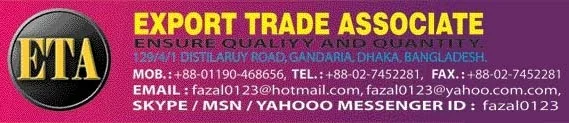 We Export Raw Jute, Jute yarn, Jute Caddies, Jute Waste, Jute Thread Waste, Jute Yarn Waste, Jute Raw felt, Jutes Goods, Jute Ropes, Cotton Yearn Waste, Garments Cutting Cliff, Waste Plastic, Vegetable, Dried Fish's And We Import Various Kinds Machinery Such As Gas Generator, Electric Motors, Machine And Tools Etc.