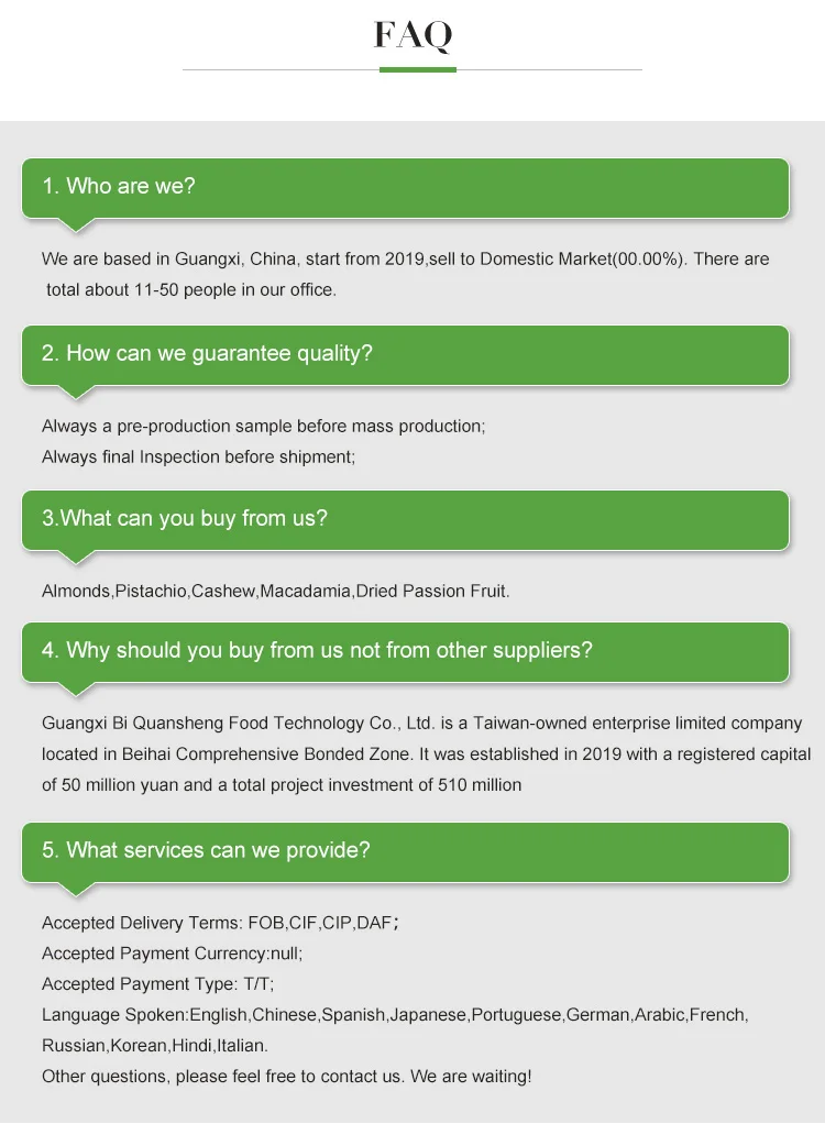 It is mainly engaged in the development, processing and sales of ready to eat dried fruits, preserved fruits, fruit juices and nuts. It is a cross-border e-commerce enterprise specializing in international trade, international trade business services, on-site processing of imported goods and OEM. After the project is put into operation, the processing business of various nuts and dried fruit raw materials can achieve an annual output of more than 100000 tons. The company's main commodity nuts are: walnuts, almonds, pistachios, cashews, pecans, macadamia nuts. At present, Guangxi, China has signed a contract for 100000 mu of macadamia nuts, and the government + farmers + enterprises work together to build a 300000 Mu nut planting industry. Dried fruits include: dried mango, dried passion fruit, dried pineapple, Dried Kiwi fruit, dried fruits and vegetables, etc.