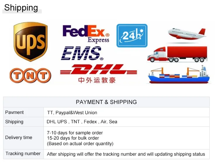 - It could be shipped by sea, by air, or by express (EMS, UPS, DHL, TNT, FEDEX etc). Please confirm with us before placing orders.