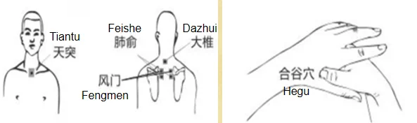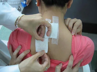 1, Uncover the separation layer on the protective layer and the paste, clean the skin, patients paste in Tiantu, Dazhui, Feishe, Fengmen, Hegu; Mild patients can only used it in Feishu and Dazhui(see the schematic diagram of acupoints).