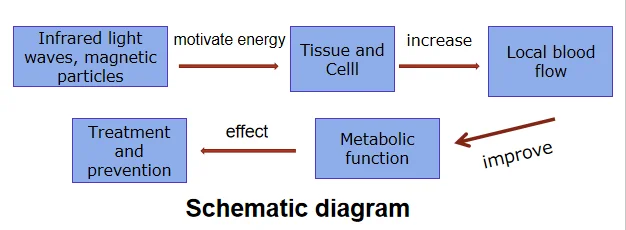 By radiating 4um~16um wavelength far infrared ray and magnetic remanent induction intensity generated by magnetic powder, so as to activate cell tissue, increase local blood flow, improve blood circulation, improve metabolic function to achieve the purpose of treatment and health care.