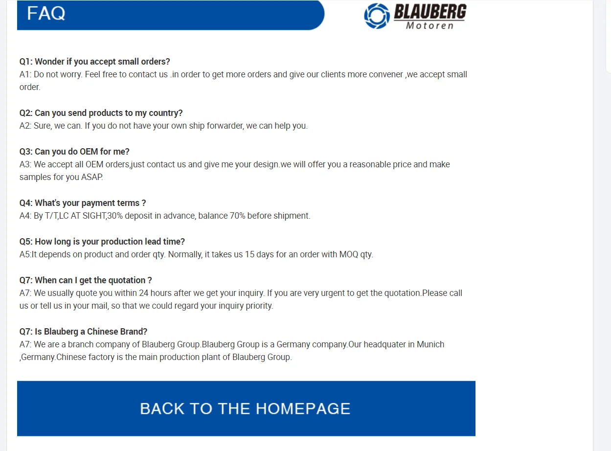 A7: We are a branch company of Blauberg Group.Blauberg Group is a Germany company.Our headquater in Munich ,Germany.Chinese factory is the main production plant of Blauberg Group.