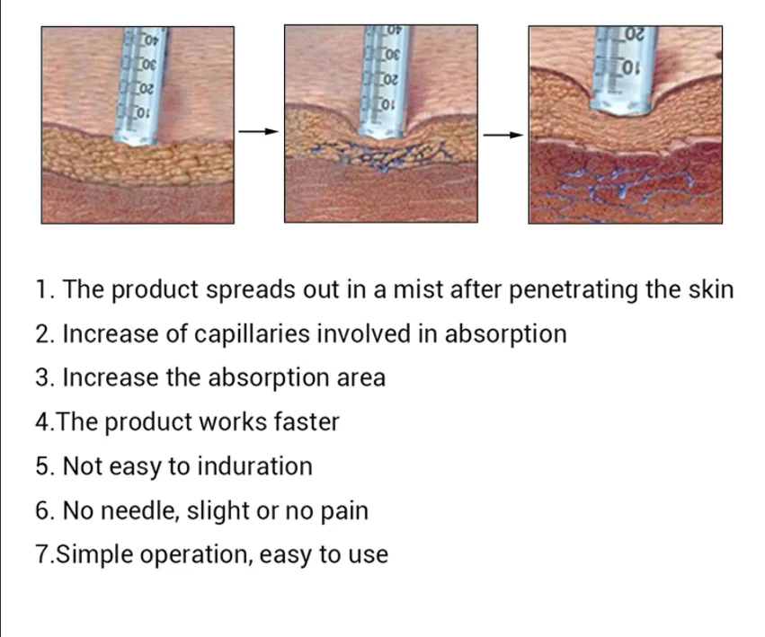 1.Needle Free mesotherapy pen Many people suffer from needle phobia. Our Needle Free Technology alleviates needle phobia with needle-free injection. |