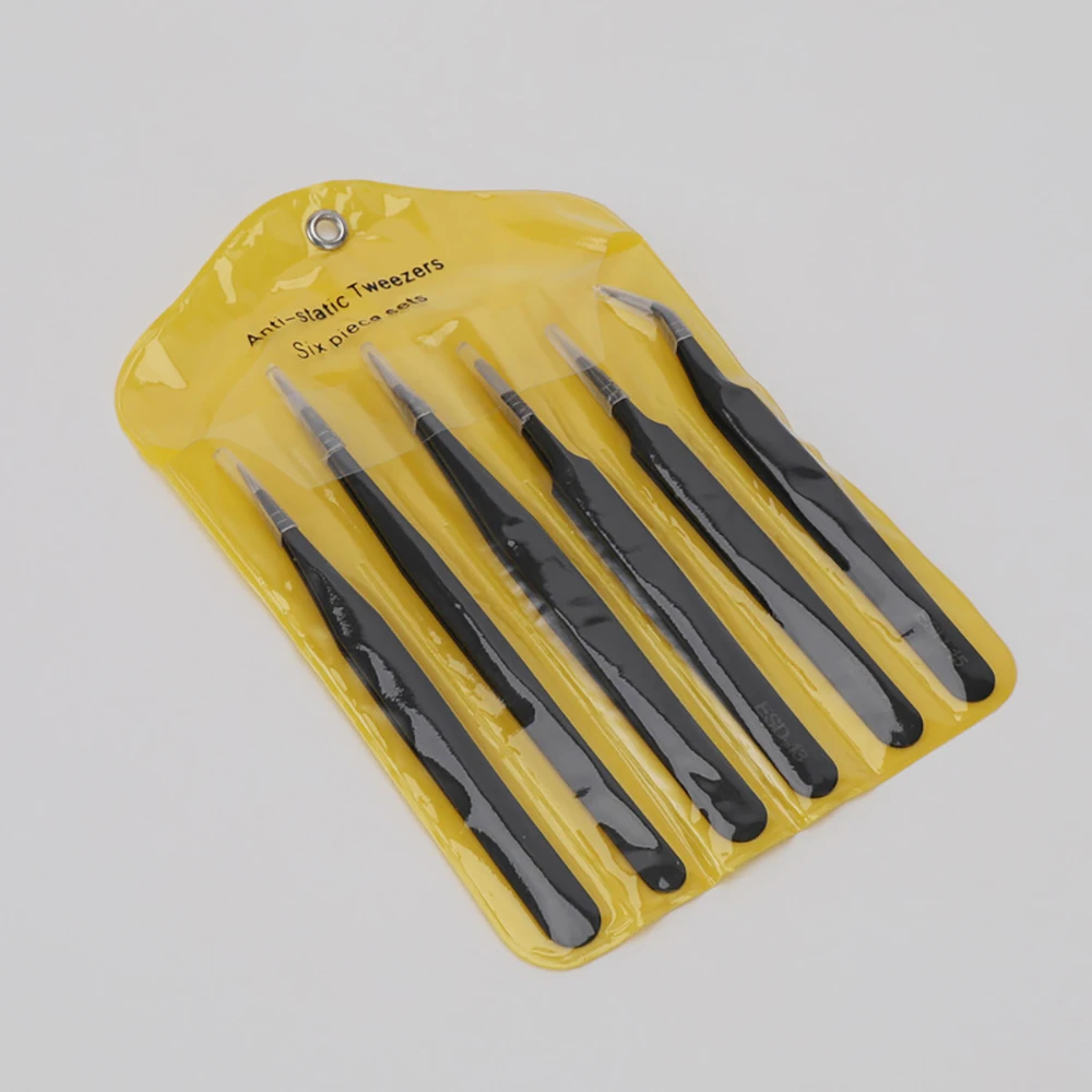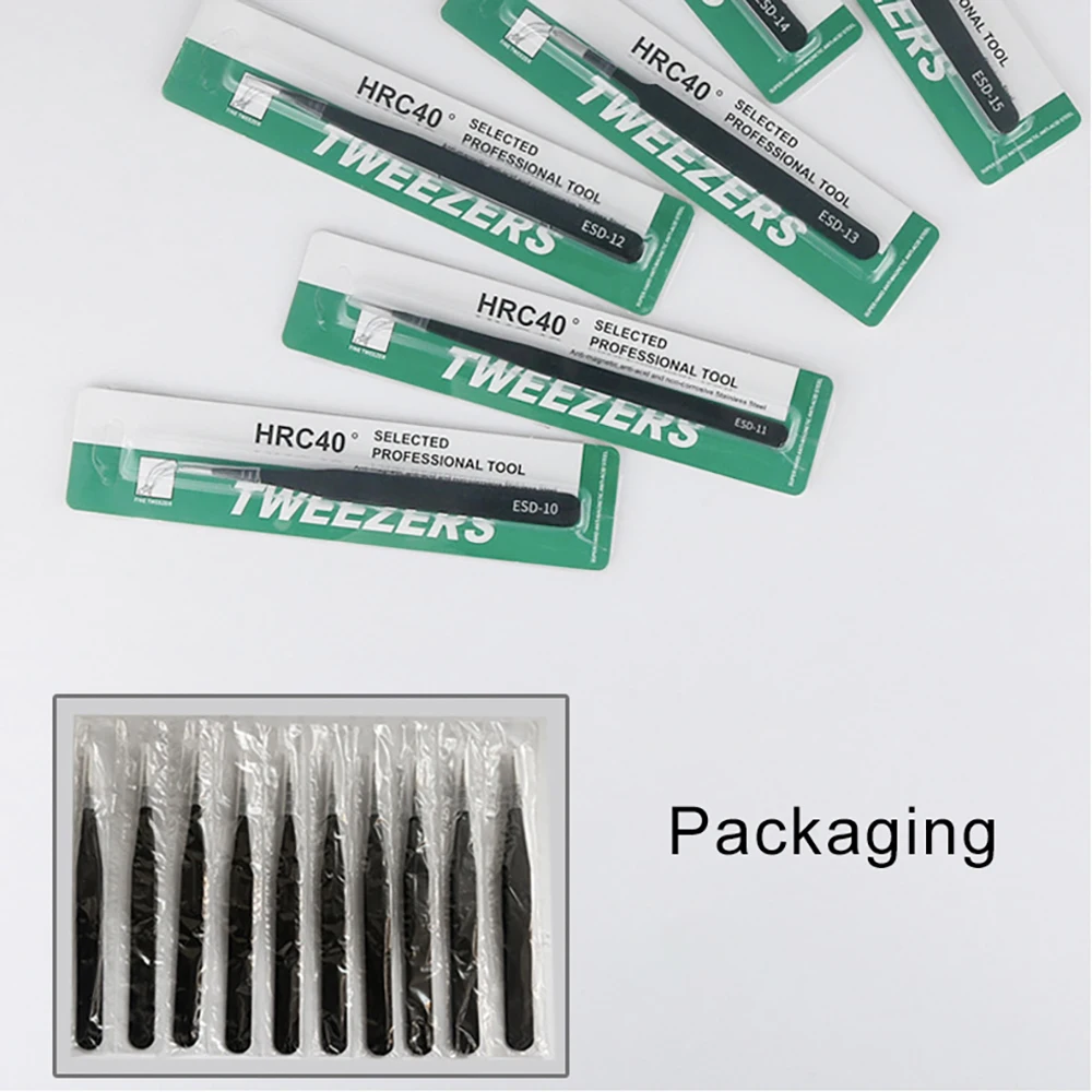 Feature | 1. Made of 100% stainless steel with a matte-black, non-slip finish; polished for durability and lasting performance. 2. Each tweezer tips are well-packed by nice plastic covers. 3. Anti-static ESD, High-quality construction 4. Various tweezer sizes and configurations work well for multiple purposes 5. Portable, practical, durable 6. Expertly calibrated tension for strong grip 7. Suitable for professional use or home use |