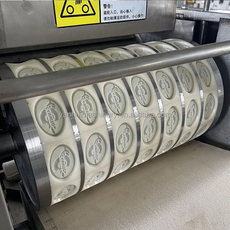 This machine is for crispness biscuit and walnut biscuit roll printing and pressing to form biscuit shape. Feed the mixed raw