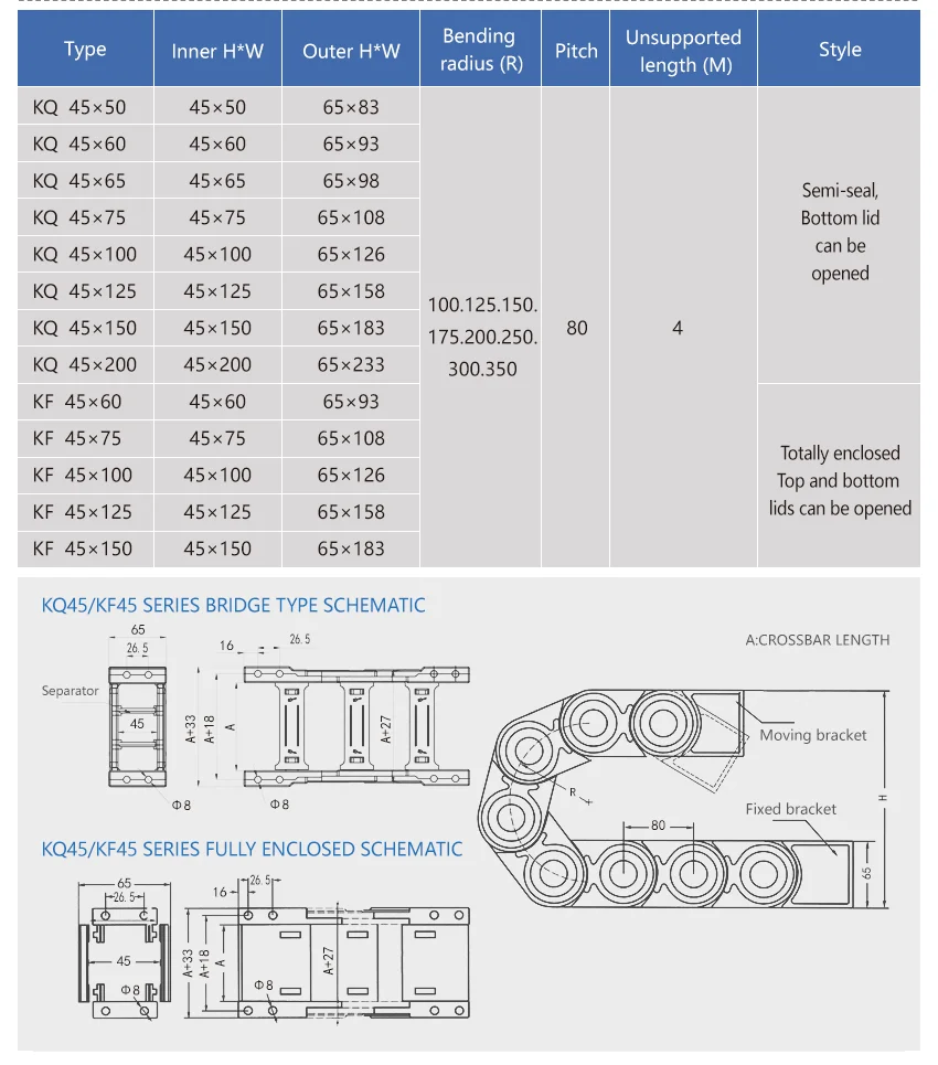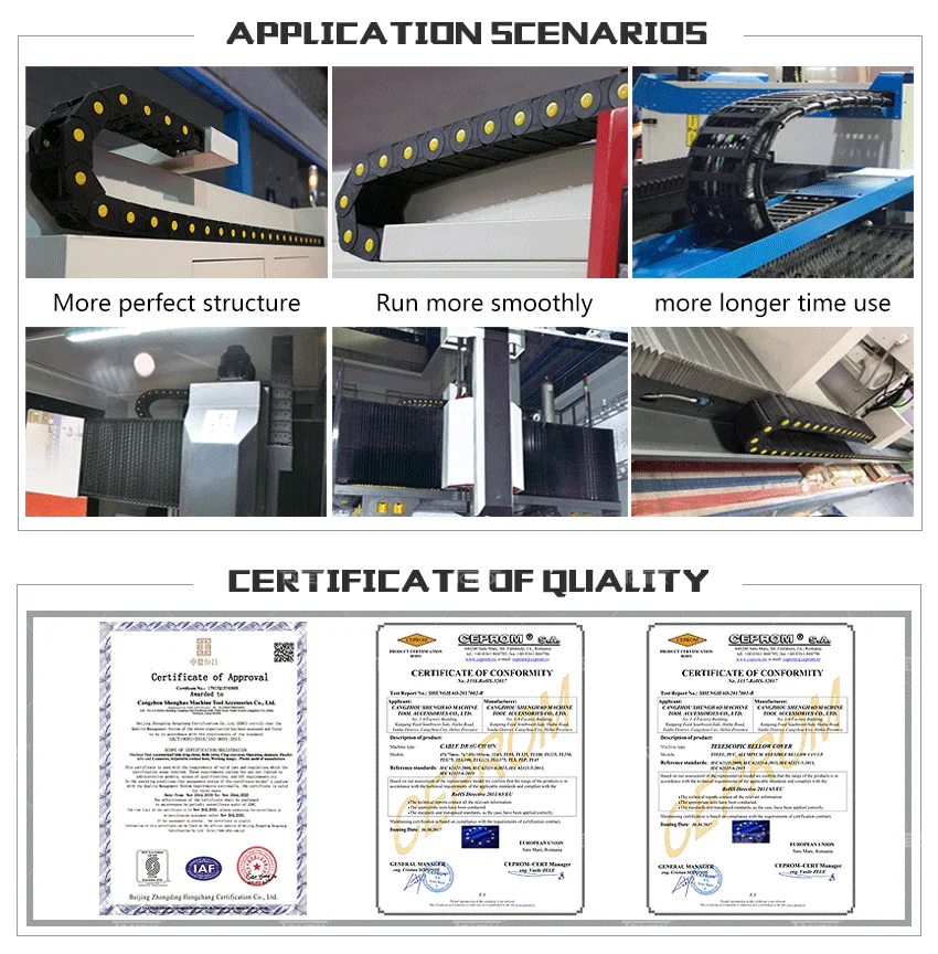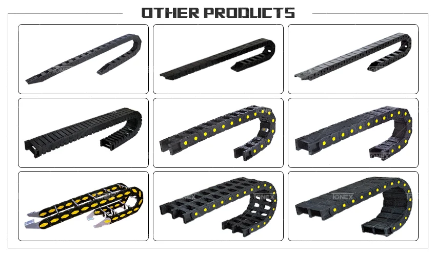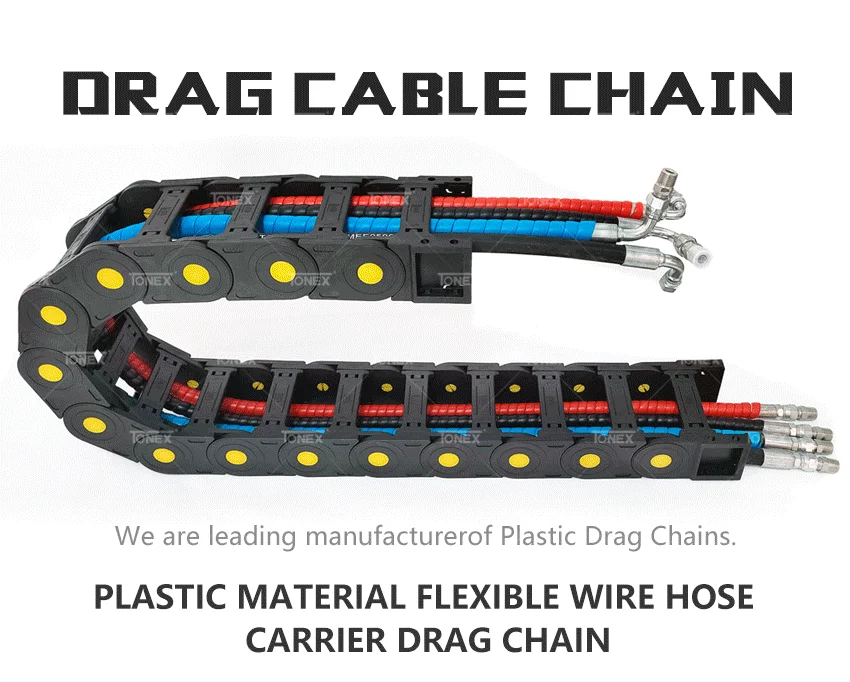 Drag chain is suitable for the CNC machine tools, machining centers, automated machinery and production lines and other kinds of machine tools, robots, transport machinery, measuring instruments, handling device and other liquid drive controlas a wire, cable, gas hose protection device, can take on machine tools, machinery and equipment moving parts run harmoniously, can play a safety protection and the ability to guide, can prolong protected wire, cable, liquid, hydraulic hose service life and reduce consumption, can greatly improve the machine tools, machinery and equipment of wire, cable, liquid, gas hose to confirm the unorderly situation existing in distribution, make it tidy and rules is arranged together, can enhance the overall artistic effect of machine tools.