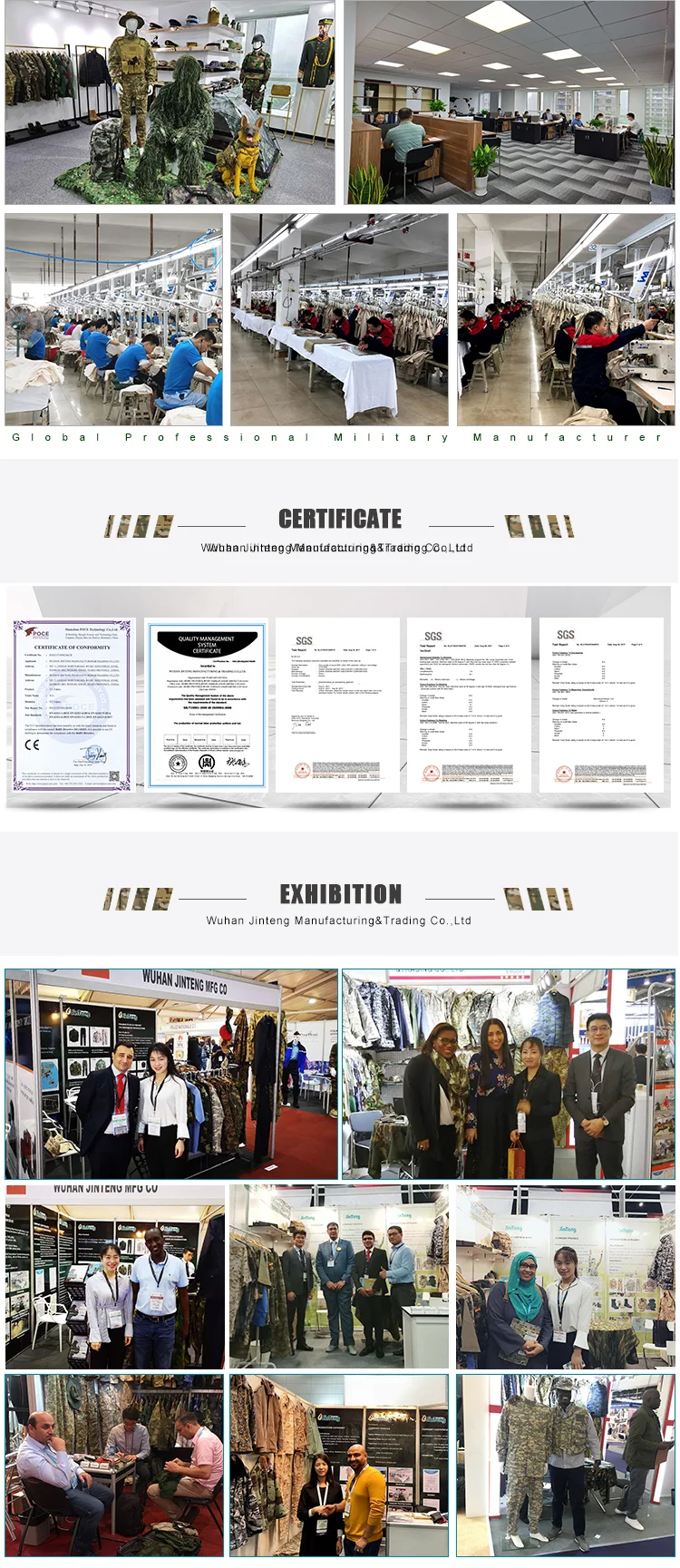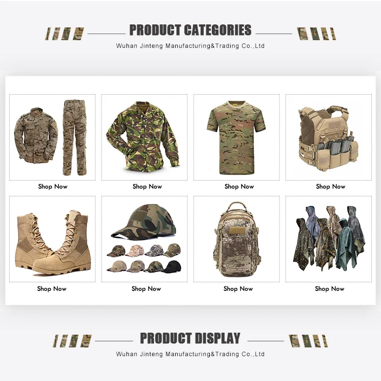 Wuhan Jinteng Manufacturing&Trading Co.,Ltd was founded in January 10, 2002, which is a specialized manufacturer for military & police garments and outdoor protective products, It covers an area of 7800 square meters, with 5600 square meters of production workshops and warehouses. Besides, it owns over 200+ skilled workers and a large number of professional technology and management staff,which is equipped with modern equipment and advanced management mode.Our factory major products are as follows: various military uniforms, field jackets,multiple pocket trousers, wool overcoats,tactical vests, raincoats, sweater, shirts and overalls.Its annual capacity has reached nearly 20 million pieces. Because of its superior quality and excellent workmanship, WUHAN JINTENG is praised by the customers from Europe, America, Middle East Area, Africa and Latin America countries .Hope we can create a brilliant future together!