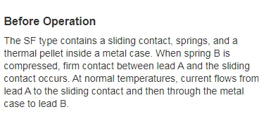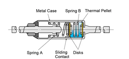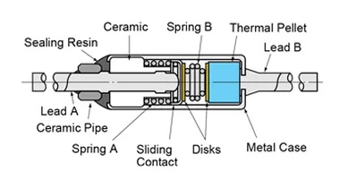 The SF type contains a sliding contact, two springs and a thermal pellet inside a metal case. Under normal temperatures, the