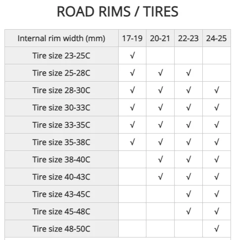 (2) 25mm wide wheel sets can be fitted with 25mm and 28mm outer tires.