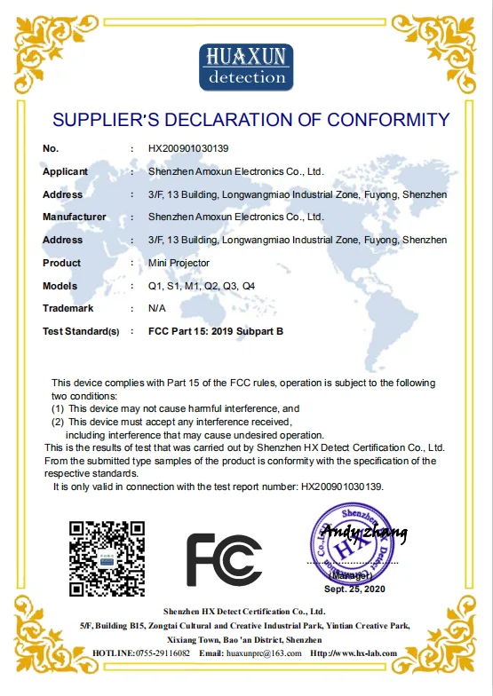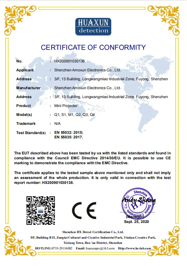 Shenzhen Amoxun Electronics Co., Ltd. is a national high-tech enterprise specializing in LC D projector, D L P projector, Mini projector manufacturing. Founded in 2015, Amoxun currently has an independent R&D team. At present, the company has 8 national utility model patents. With rich professional projector development experience, innovative marketing thinking, and Amoxun people's efforts, the company has successfully developed a variety of mini projectors, which not only meet the office use, but also the portable design has been unanimously recognized by customers. In 2015, our company passed CE/ F C C and other foreign certifications Under the leadership of C E O Alan Zhu, the company's monthly production capacity has reached more than 60,000 sets and has undertaken many O E M /O D M manufacturing services, which has driven the explosive growth of the company to the world. Our customers and partners now not only cover every province in China, but are also attracting more and more customers and global business partners. In the past few years, with a fast-growing professional international sales team, Amoxun’s export business in “projector segment” has been growing bigger and bigger with its one-stop services from design, R&D, production and logistics. With good quality and professional service, Amoxun's export business in the "projector field" is growing continuously. We are committed to serving each and every customer. Our company's motto is: A group of people do one thing for a lifetime.