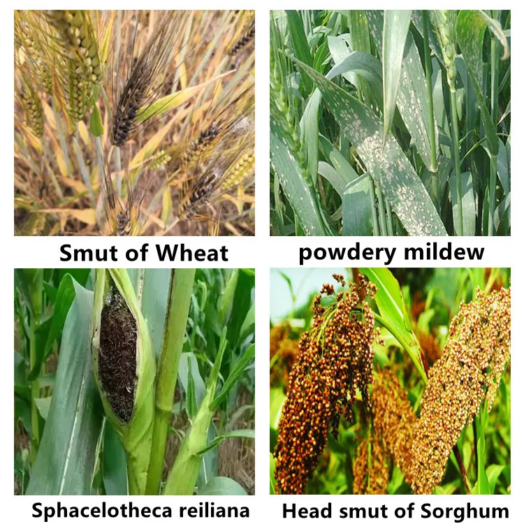 Mode of Action And Usage | Used to control Grapes powdery mildew and black rot, apple scab, rust coffee.Triazole systemic fungicide with broad spectrum protective, eradicate and curative action. It is a kind of sterol demethylation inihibitor (DMI) to prevent the synthesis of ergosterol in cell membrane, which will cause the death of fungi. Crops: Lawn, tee tree, vegetable, fruit tree, etc. Control: Control of many fungi, particularly Ascomycetes and Basidiomycetes, e.g. Podosphaera leucotricha and Venturia inaequalis on apples, Guignardia bidwellii and Uncinula necator on vines, Hemileia vastatrix on coffee, and Cercospora spp. on peanuts, at 15-250 g/ha. Also used on bananas, cucurbits, peppers and other crops. |