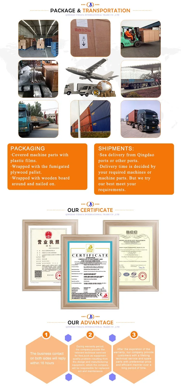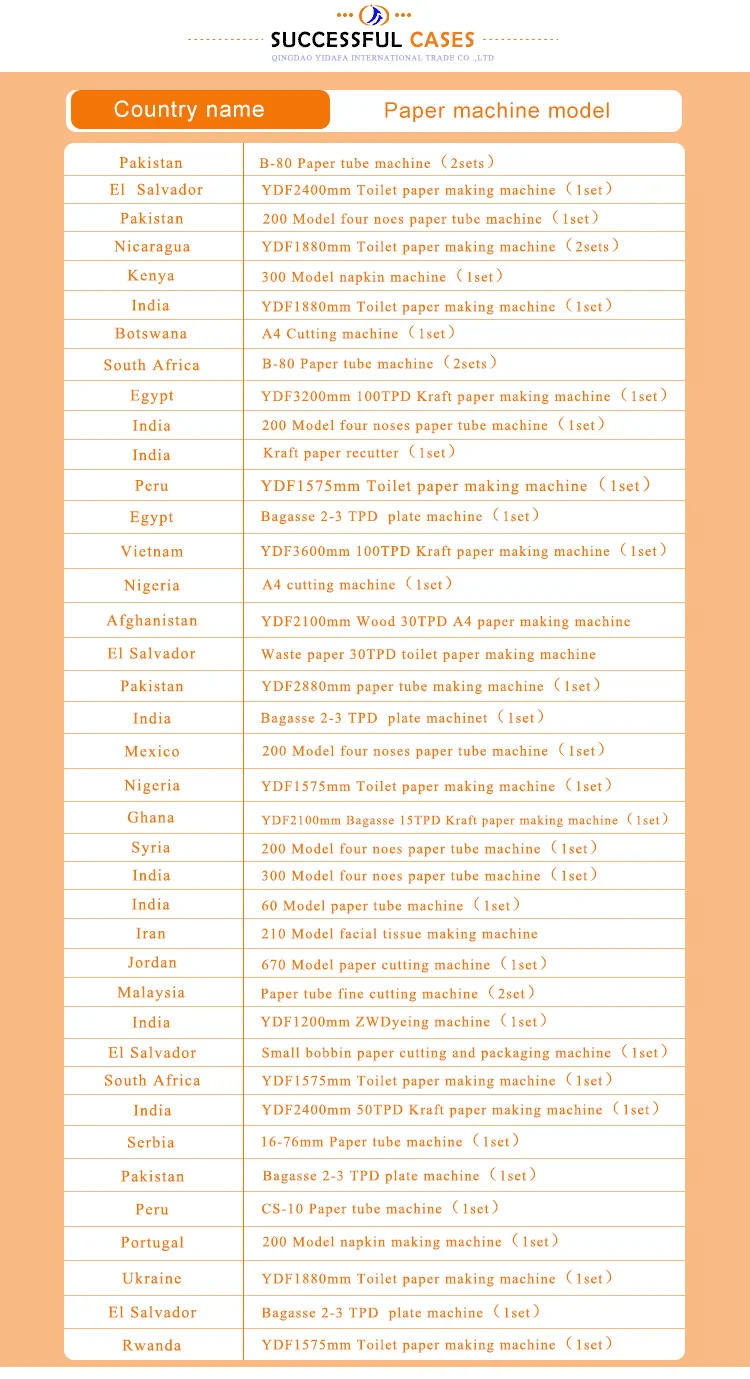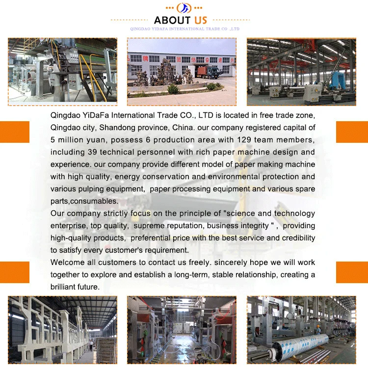 Qingdao YiDaFa International Trade CO.,LTD is located in Free Trade Zone,Qingdao city, Shandong Province,China.Our company registered capital of 5 million yuan,has rich paper machine design and experience, and is the collection of paper making machinery research, design, manufacture, installation ,commissioning and service, becoming one of the multi-functional enterprise.Our company has several paper machine manufacturing enterprises and keeps a long-term and stable cooperation with the first-class large paper machinery manufacturers in the world.Our company can provide for global customers with tissue paper machine, office supplies paper machine, packaging paper machine, white board paper machine with different types,high quality,energy conservation and environmental protection and pulping equipment, paper processing equipment and various accessories, spare parts,consumables.
