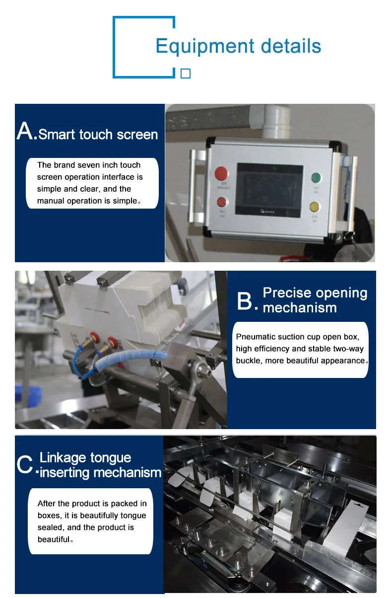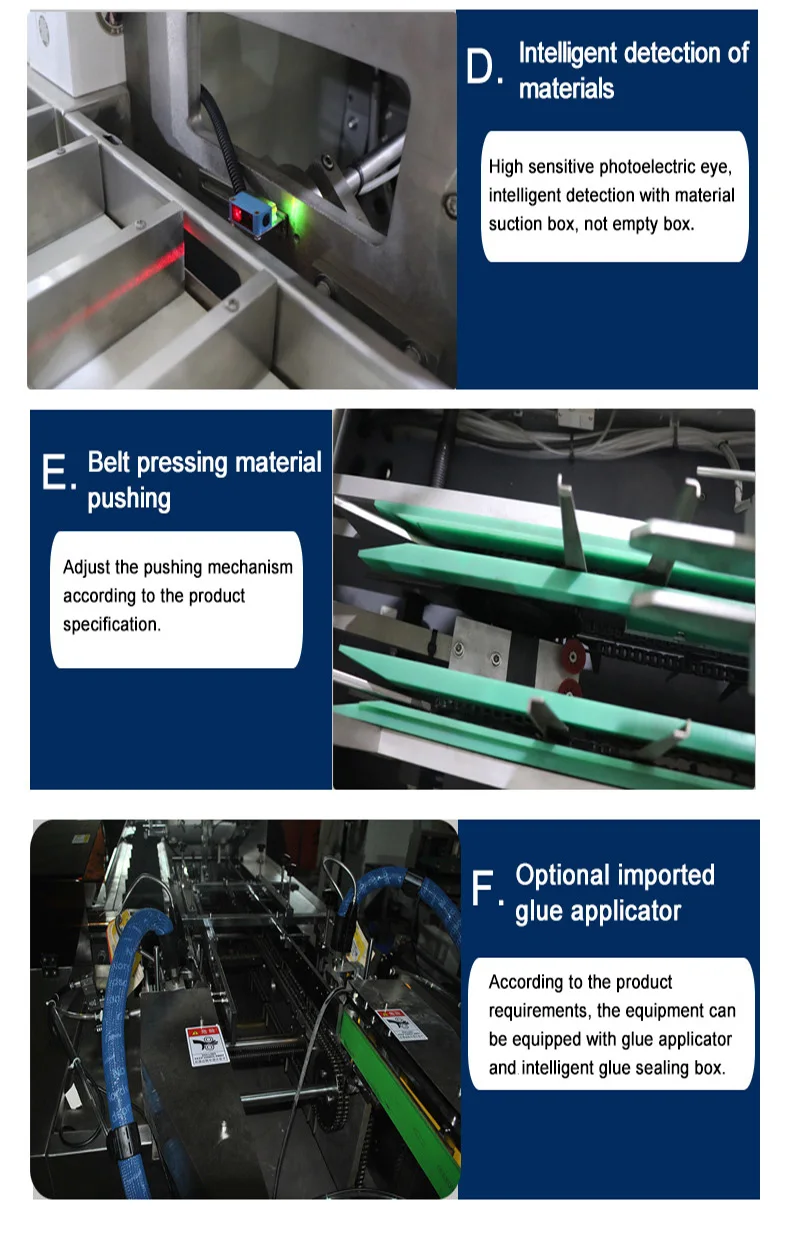 d.When the box’s feeding position is not correct, or there is no box, or there is no leaflet’s feeding, the machine will be stopped automatically.