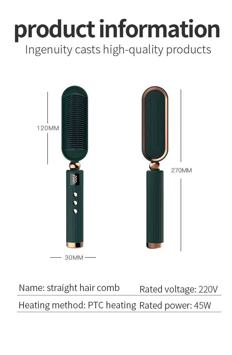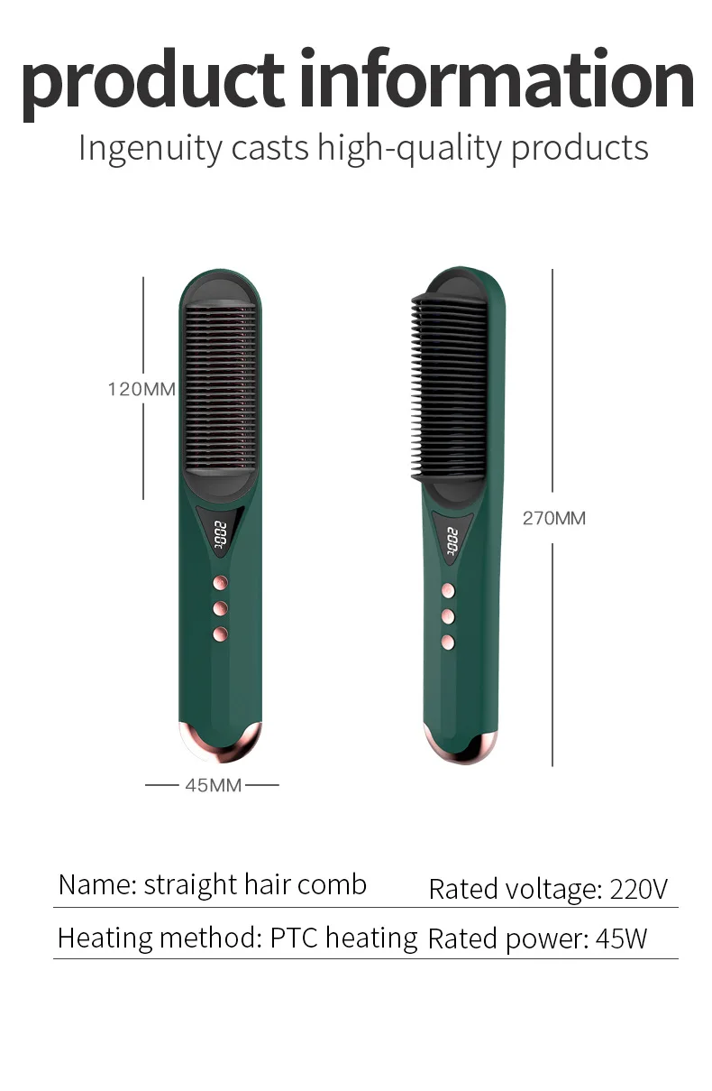 PA6+30%GF material, 100~200℃ constant temperature control, 7 levels of free temperature adjustment (plus or minus 15℃ for each level), PCT heating, negative ions will not hurt hair, liquid crystal display temperature, 30S instant use, 36H stereotypes, Uniform heating, dual-purpose direct-rolling, anti-scalding design, support power supply: European power supply/British power supply/Australian power supply/U.S. power supply