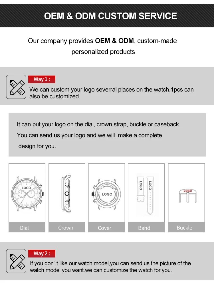 We can put your logo on the dial, crown, case back, buckle and band.