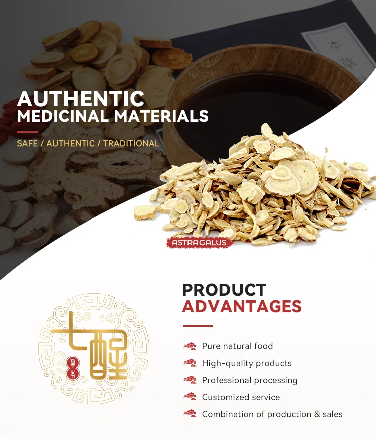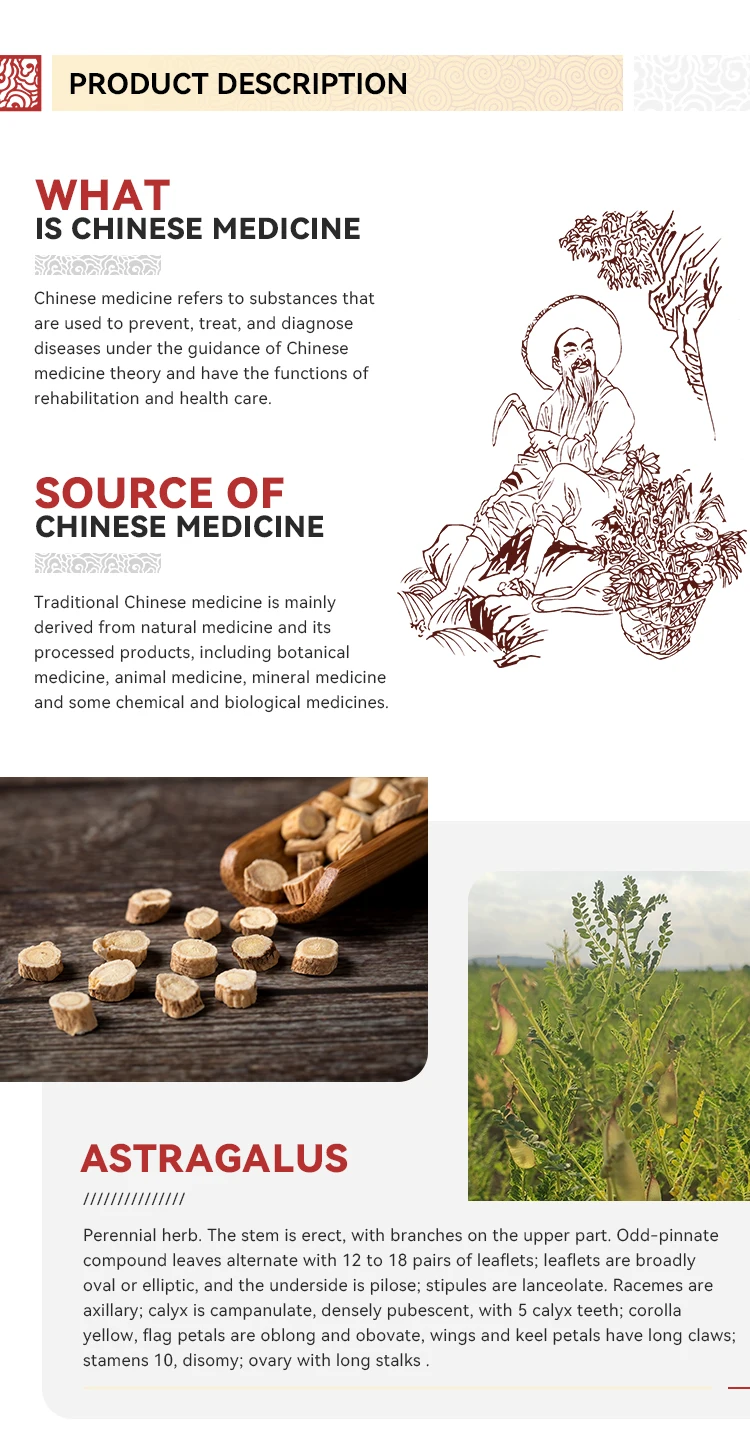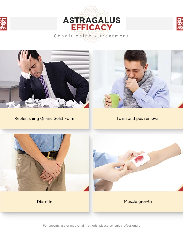 Astragalus: invigorating qi and promoting yang, solidifying the surface and antiperspirant, diuresis and swelling, promoting body fluid and nourishing blood, promoting stagnation and clearing numbness, supporting toxins and purging pus, astringing sores and generating muscles. It is used for qi deficiency and fatigue, lack of food, loose stools, subsidence of qi, chronic diarrhea and prolapse of the anus, bleeding and uterine bleeding, superficial deficiency and spontaneous sweating, qi deficiency and edema, internal heat and thirst, blood deficiency and chlorosis, hemiplegia, arthralgia, numbness, carbuncle incurable, chronic ulcer Not grabbing.