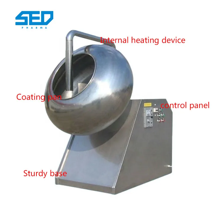 The speed can be adjusted and the hot air blower will be equipped on the machine. The coating bowl is made of stainless steel and the frame is made of normal steel with painting.