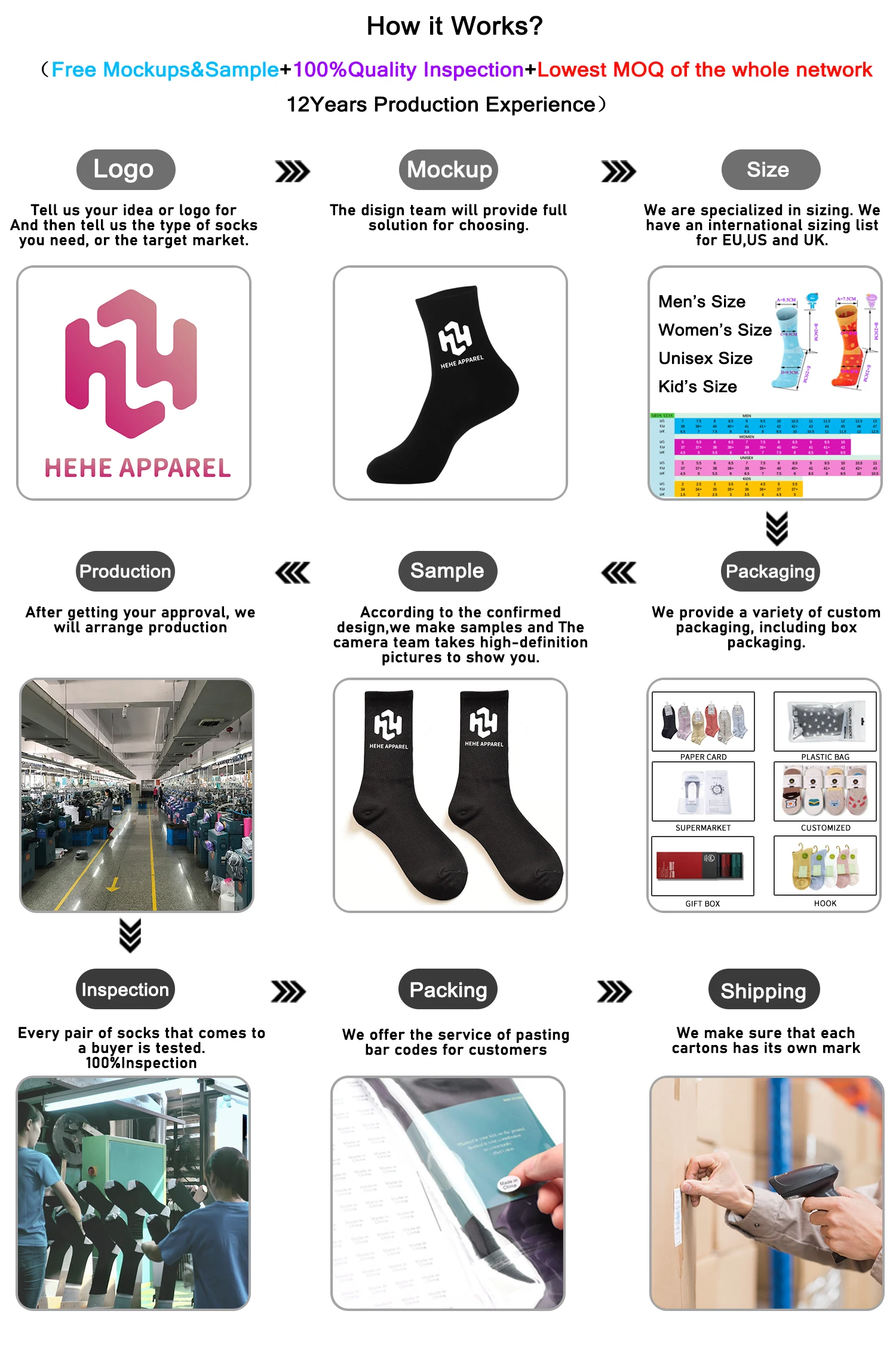 Logo, Design and Color: | Offer Custom option, make your own designs and unique socks. | ||||||