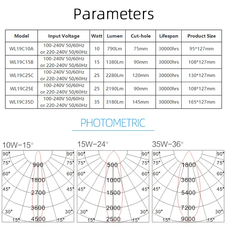 WL19C15B | 100-240V / 50-60HZ | 15w | 1380lm | 90mm | 50000hrs | φ108×H127mm |