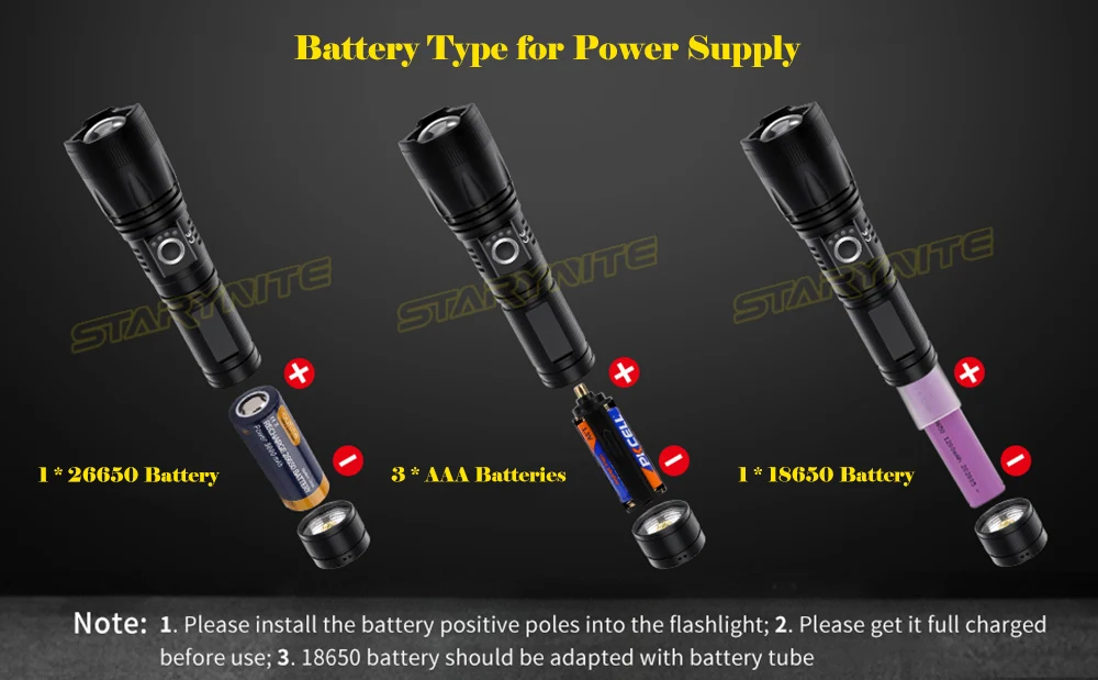 9 | Battery Type | 1 * 26650 / 1 * 18650 / 3 * AAA Batteries | 22 | Logo position | Aluminum Part | |||||