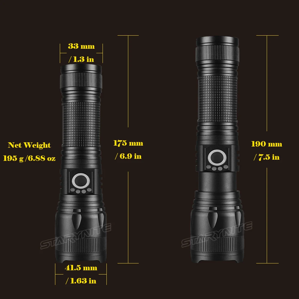 1 | Lighting Source | 1 * XHP-50 Led | 14 | Product Size | Head:41.5mm/1.63in; Tail: 33mm/1.3in; Length: Zoom Out:175mm/6.9in; Zoom In:190mm/7.5in | |||||