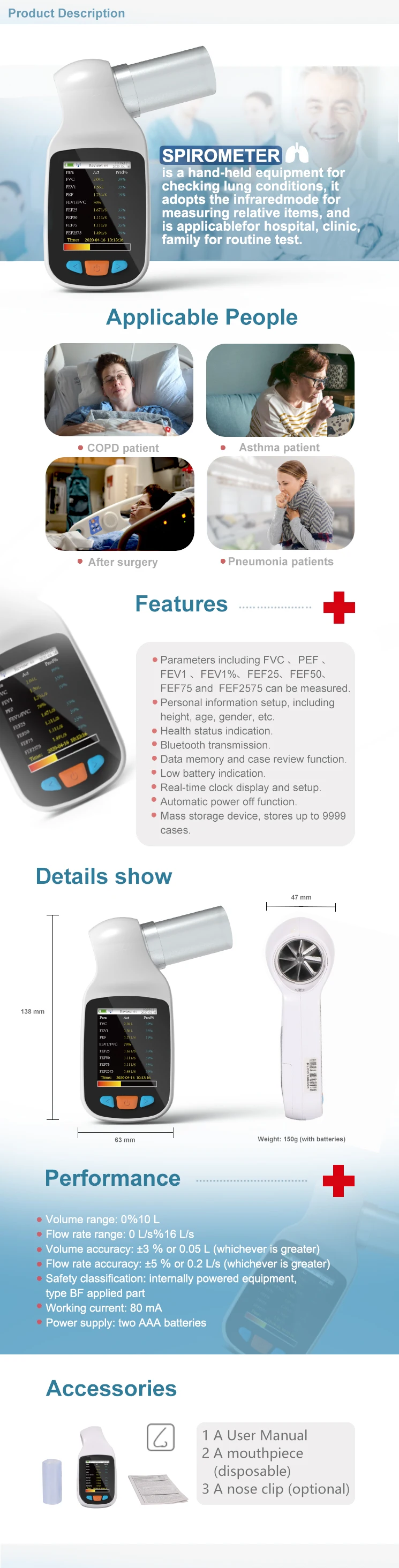 SPIROMETER is a hand-held equipment for checking lung conditions, it adopts the infrared mode for measuring relative items, and is