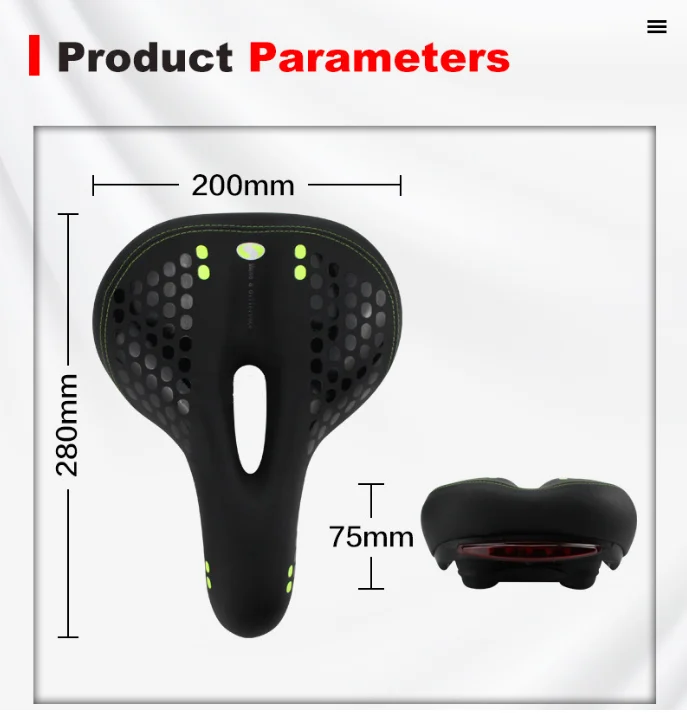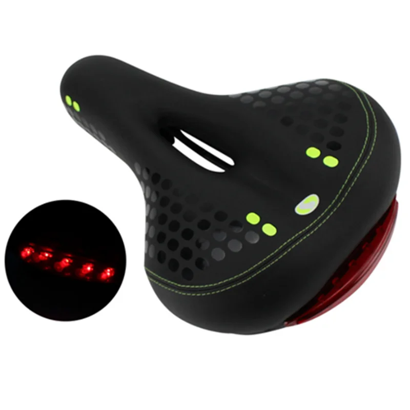 Features | * [ TAIL LIGHT UNIQUE DESIGN: WITH WATERPROOF BRIGHT TAILLIGHT,MORE EYE-CATCHING AND SAFER WHEN RIDING AT NIGHT OR RAIN.] The safety rear warning light of wide bike seat cushion has 5pcs super bright LED lamp beads, living waterproof. 3 lighting modes for your choices, offer you optimal visibility for safe cycling. Stop waste money and time to buy taillight, solve the trouble of install taillight. Enjoy your rides in , worry no more about accidents or unfortunate incidents in the dark * [COMFORTABLE WIDE BIKE SEAT: BIG SHAPE AIR VENTILATIO ERGONOMIC CHANNEL COOLS SPEED AIR CIRCULATION AND RELIEVES PRESSURE. ]Measurements:12.2 inches long, 8.26 inches wide.Ergonomic design to better fit hip and it won't affect the thigh movement.Humanized hollow breathable design to Ease pressure of the private. Say goodbye to the pain and enjoy the fun of riding a bike now * [SOFT AND ELASTIC: NON-SLIP, WEAR-RESISTANT, THE BEST PROTECTION OF THE HIP. ] West biking comfortable bike seat is padded by thicken widened high-density memory foam, bike seat cushion surface is 0.9 thickness of frosted artificial leather. Anti-scratch, Wear resistant,Durable, better protect the buttocks ! In the pleasure of enjoy riding a bike * [ ONE SIZE FIT ALL: EXCELLENT SHOCKPROOF,UNIVERSAL DESIGN,EASY MOUNTING ON ANY STANDARD SEAT POST,DUAL-TRACK OR CLAMP TUBE. ] Double spring rubber ball suspension in the bottom of bicycle seat, more stable, strong shock absorption effect, better protection.This bicycle saddle fits for most bikes,included road bike, cruiser and mountain bike,etc |