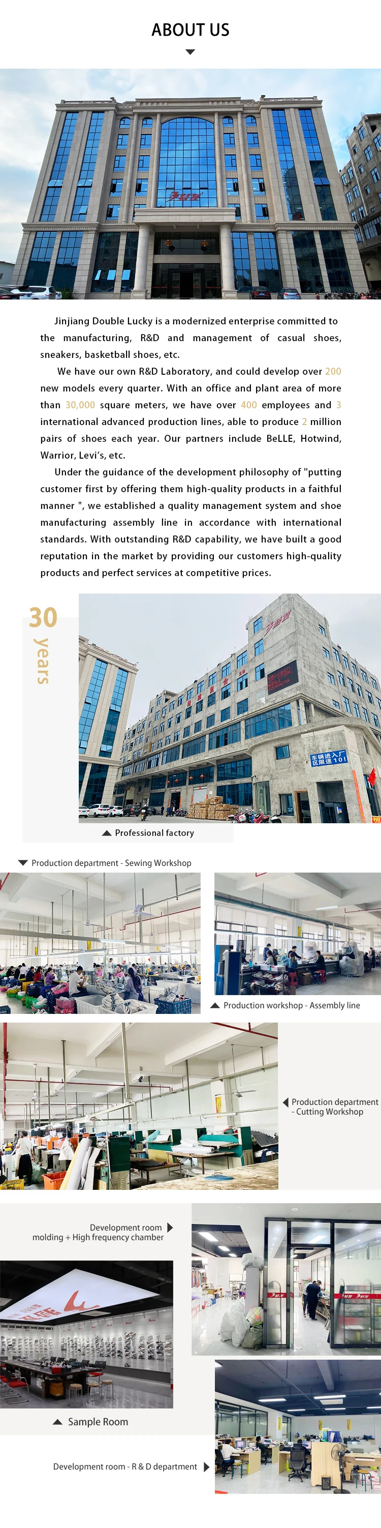 Q: Are you a factory or trading company? A: We are shoes factory with annual production capacity of 10 millions pairs. Choose us, you choose fairly price, immediate response, high-quality products and reliable lead time. | ||||||||