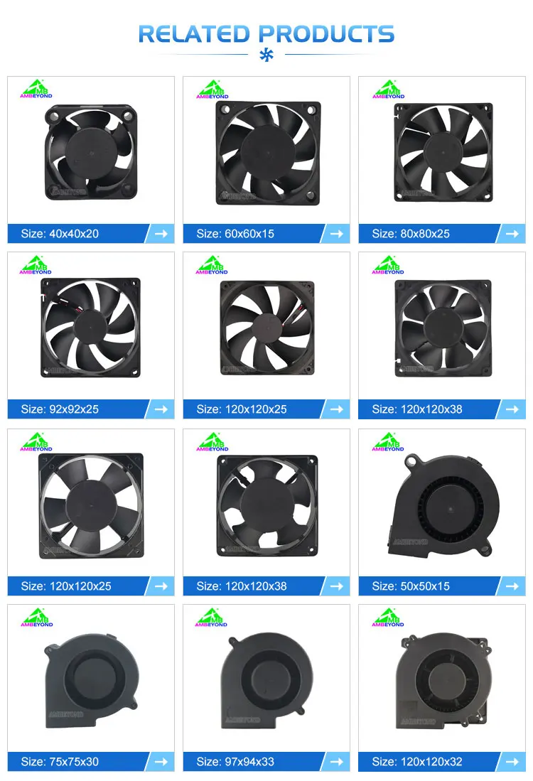 The main product line of AMBEYOND has AC Fan(6-25cm), DC Fan(2-25cm), EC Fan(2-25cm) and all kinds of Radiator, Plastic Parts, Electronic Wire, Hardware Acessories, etc.