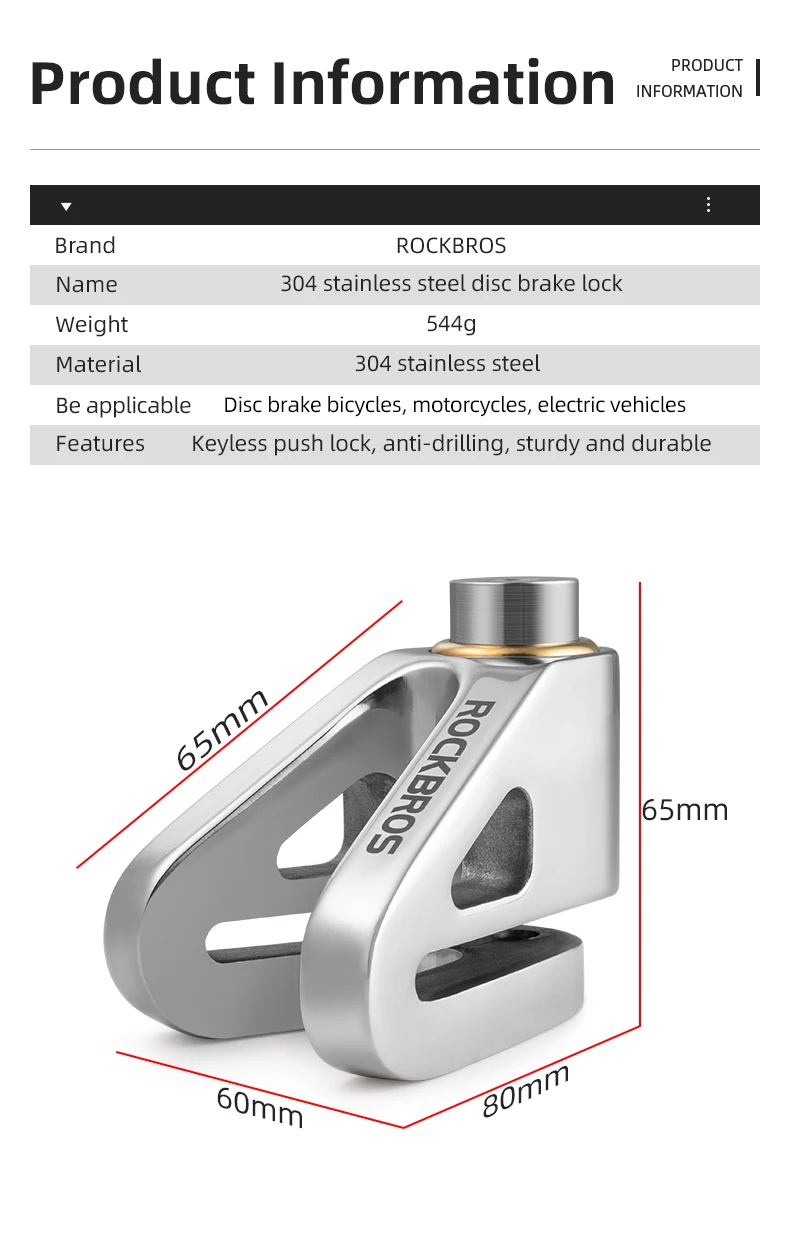 Feature | 1. One Piece Security & Anti-Theft 2. Triangle Double Beam Reinforcement 3. Keyless Lock, Press to Lock, Easy to Use 4. Suitable for Vehicles of Disc Brake, like MTB Road Bike, Motorcycle, Electronic Vehicle 5. C-level Lock Cylinder ( Zinc Alloy Lock ) 6. 304 Stainless Steel, Heat Treatment Hardened 7. Waterproof 8. Rotating, Anti Power Drill 9. Double Bevel Card Slot Key |