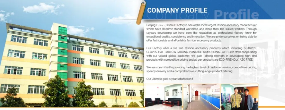 Deqing Yumei Textiles Co.,Ltd is one of the local largest fashion accessory manufacturer and exporter which owned 4000m2 standard workshop and more than 50 skilled workers.audited by Wal-Mart and BSCI,2 hours from Shanghai port. through 10years developing we have earn the reputation as professional factory known for exceptional quality ,consistency and customer services .
