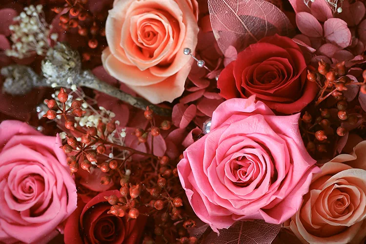 Preserved flower is made by roses, carnations, hydrangea and other categories of fresh cut flowers, after dehydration, bleaching, drying, dyeing and a series of complex processes processed as dried flowers, but it feels almost the same with fresh flowers from the color, shape, etc.It retains the characteristics of fresh flowers, it can last at least 3 years.