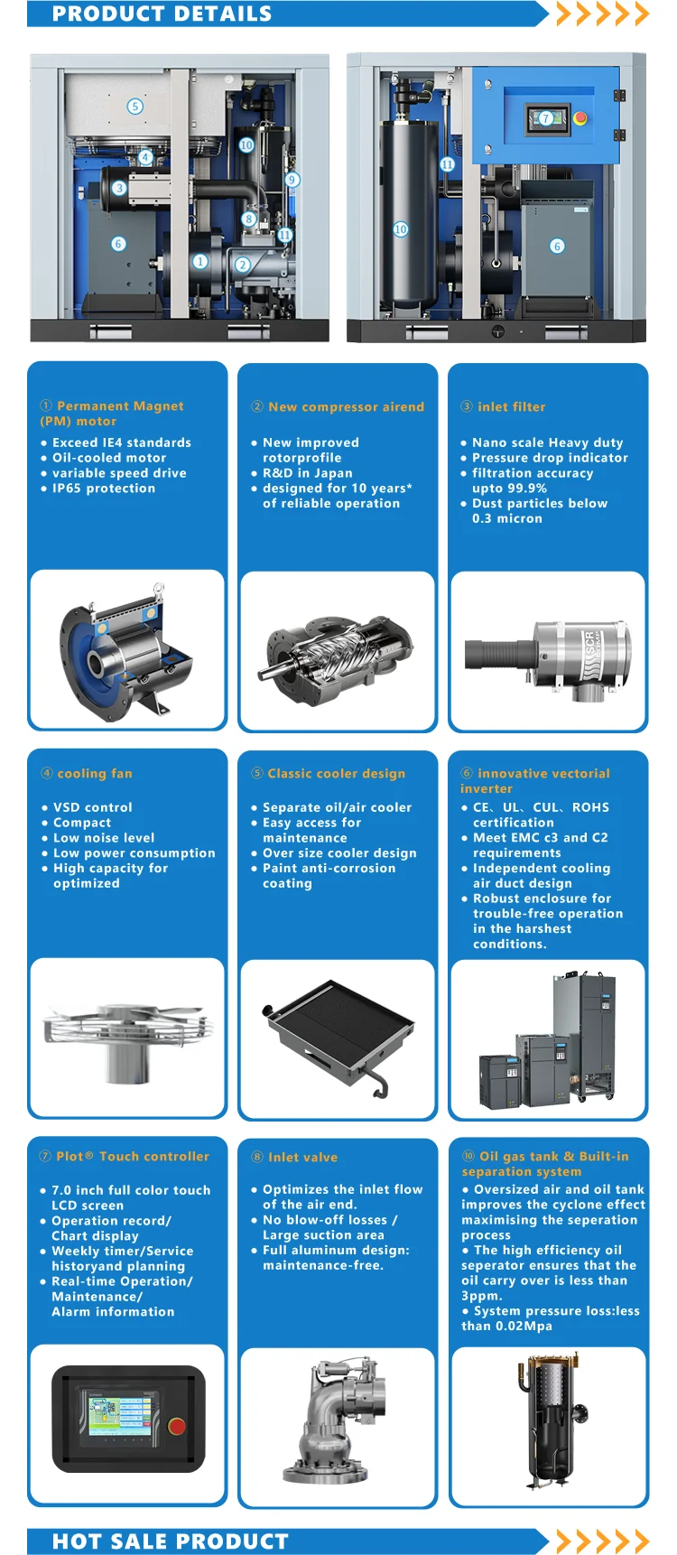 Note: The capacity is measured as GB3853 standard.(equivalent to ISO1217 Annex C) Standard voltage is 380V/50HZ/3P, other voltage is available. The recommended best capacity range is 60%-100%. Alpine/high altitude, high temperature, high huidity, high dust loads or other adverse working conditions will require specialized custom designs. These are available on special request. We reserve the right to make changes and improvements to the design and appearance. Specifications may change without prior notice. |