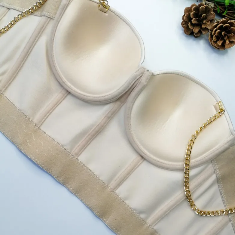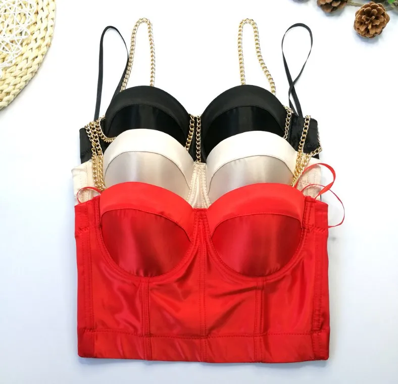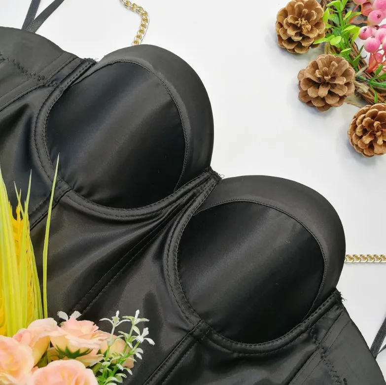 Acetic acid satin elastic suspenders inside and outside with gold chain shoulder straps plastic bodice beautiful back short fishbone top
