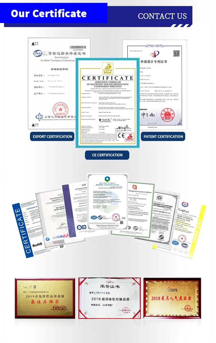 A: Foshan ShenLan Digital Co., Ltd. has launched online business for selling DTG Printer Machine, DTF Printer Machine, Screen Printer Mahicne, Digital Textile Printer, DTF Pet Film, DTF Ink, Hot Melt Power almost 12 years and established customers over 168 countries and areas. We are the Gold Supplier of Alibaba almost 5 years, and the verified user of PayPal as well as approved by TUV certification.We will provide customers with one-stop procurement services for digital printing.