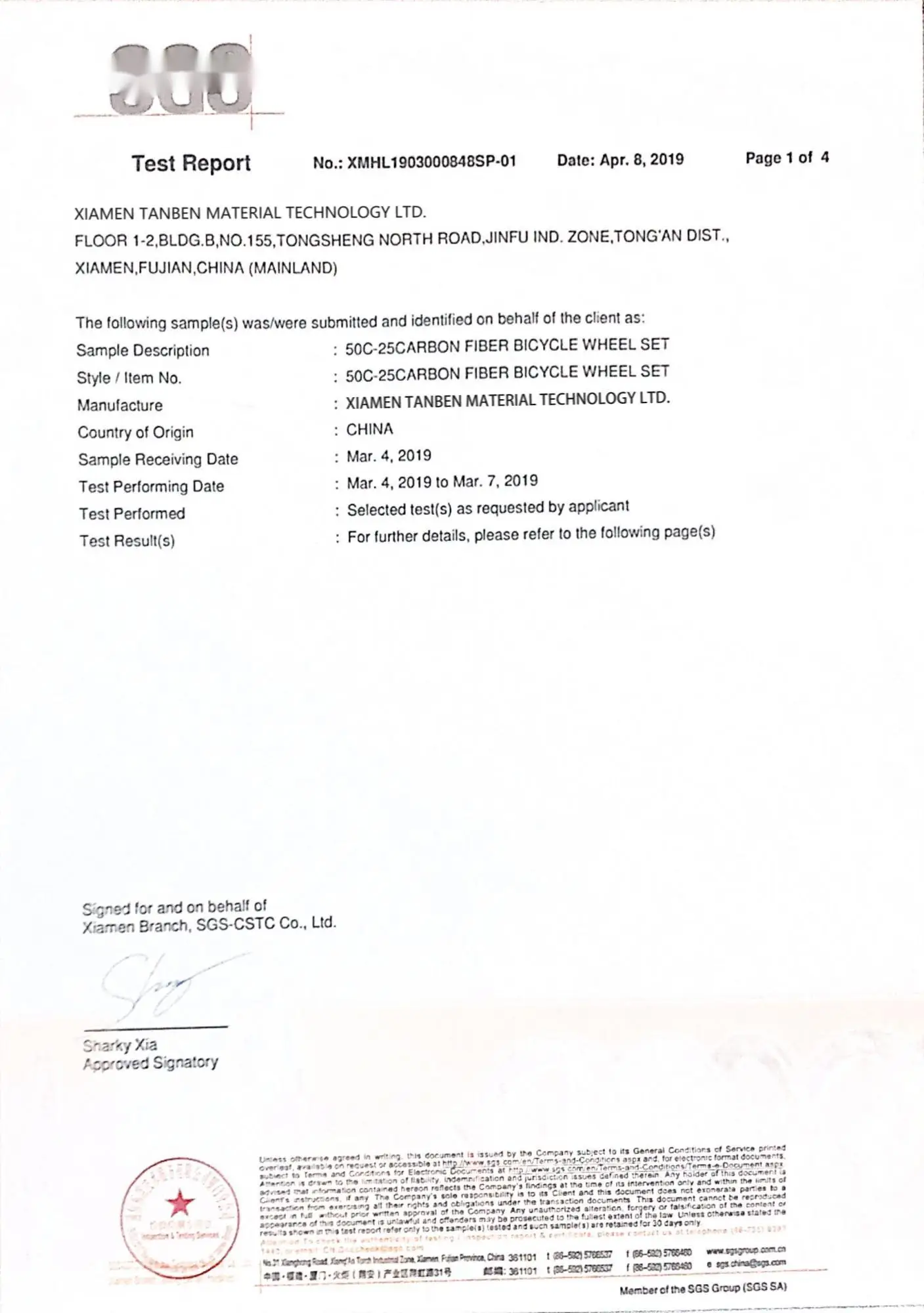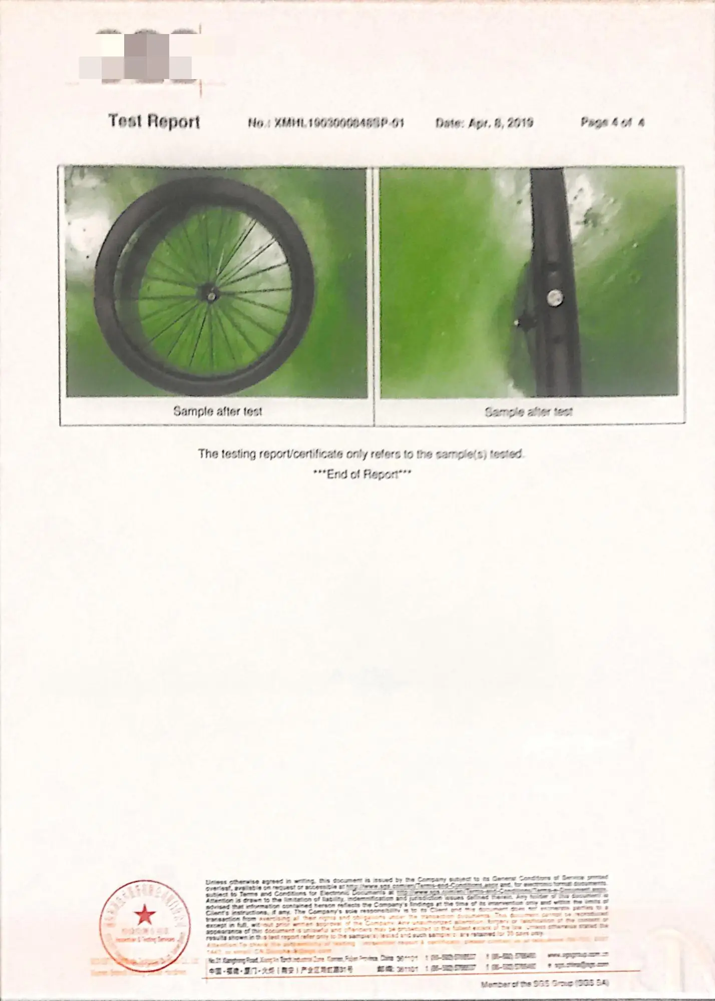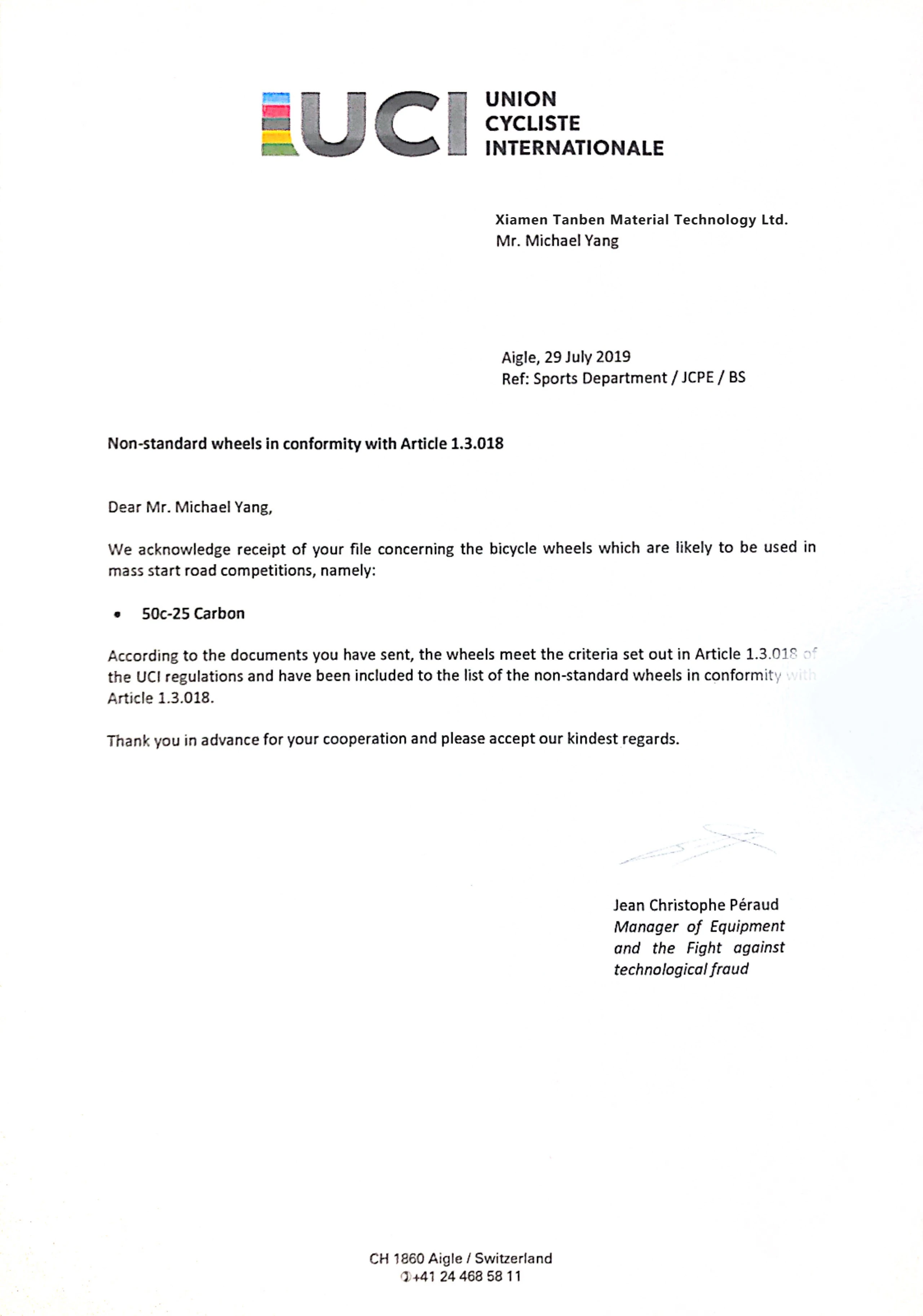 Answer: EN14781 European standard test, SGS certification,ISO9001 and Swiss UCI certification.