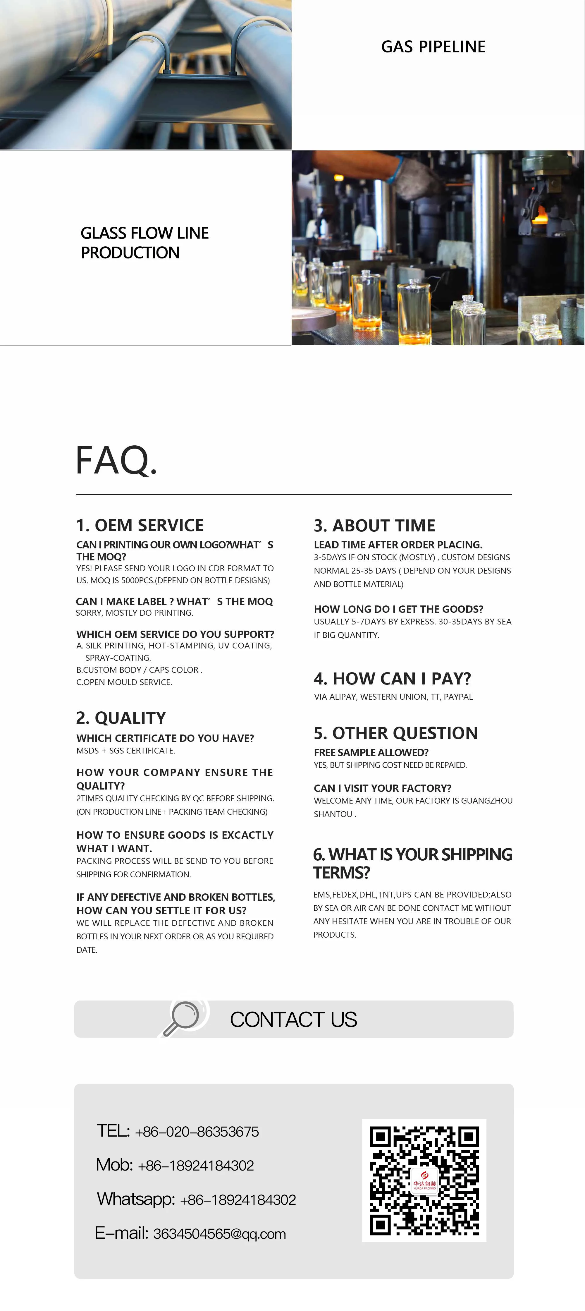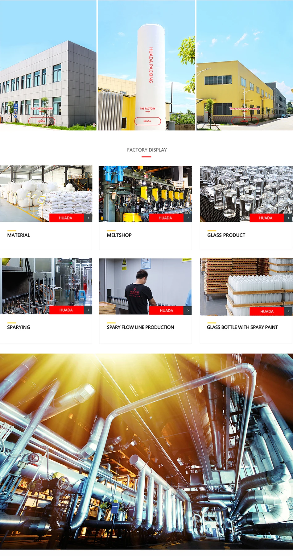 HUA DA PACKING is a professional enterprise integrating the design, production and sale of glassware together. Our main products are cosmetic packaging glass bottles and accessories, such as cosmetic bottles, cosmetic jar, gel polish bottles, essential oil bottles, serum bottles, foundation bottles, roll on bottles, glass vial, storage bottles, sets of sealed bottles, condiment bottles and all kinds of glass balls, totally more than one thousand series.